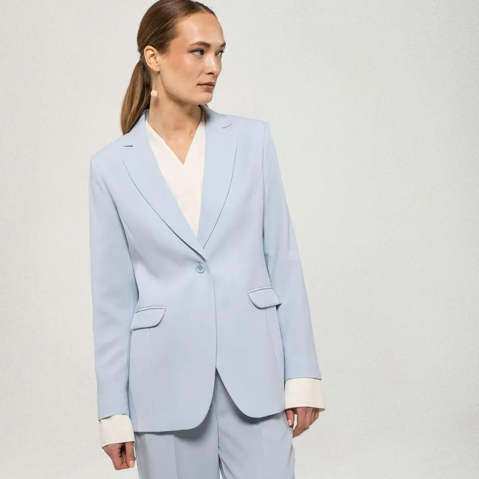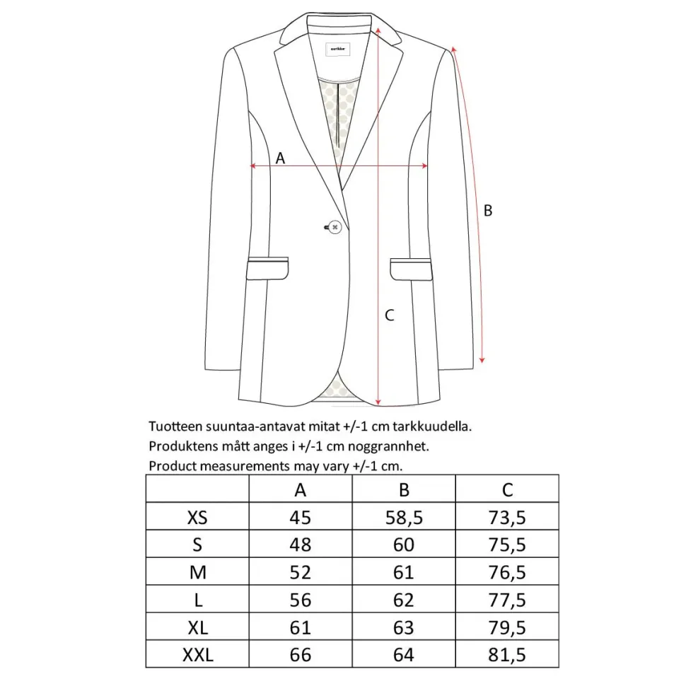 Klassinen yksirivinen bleiseri, joka on kevyesti muotoonommeltu. Sola-bleiserissä on edessä upotetut taskut, jakardikuvioitu vuori ja täyspitkät hihat. Toisessa hihansuussa puunappi. Suunniteltu Suomessa.