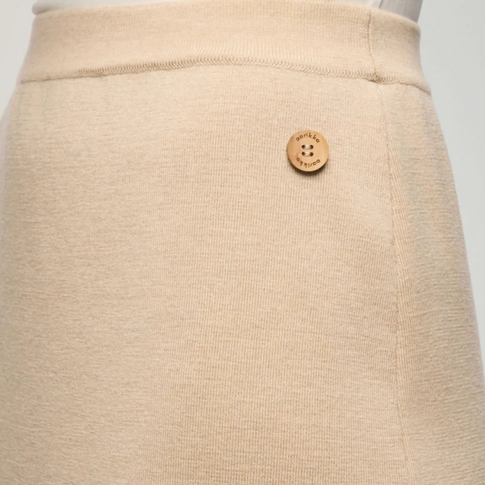 Suoralinjainen Hymy-neulehame on kestävä ja helppohoitoinen klassikko. Monikäyttöinen hame istuu kauniisti ja on sopivasti väljä. Hameen mukava ja hengittävä materiaali takaa sen, että villahame sopii käytettäväksi kaikkina vuodenaikoina. Kokonaisuuden viimeistelee helmassa oleva halkio ja Aarikan puunappi.