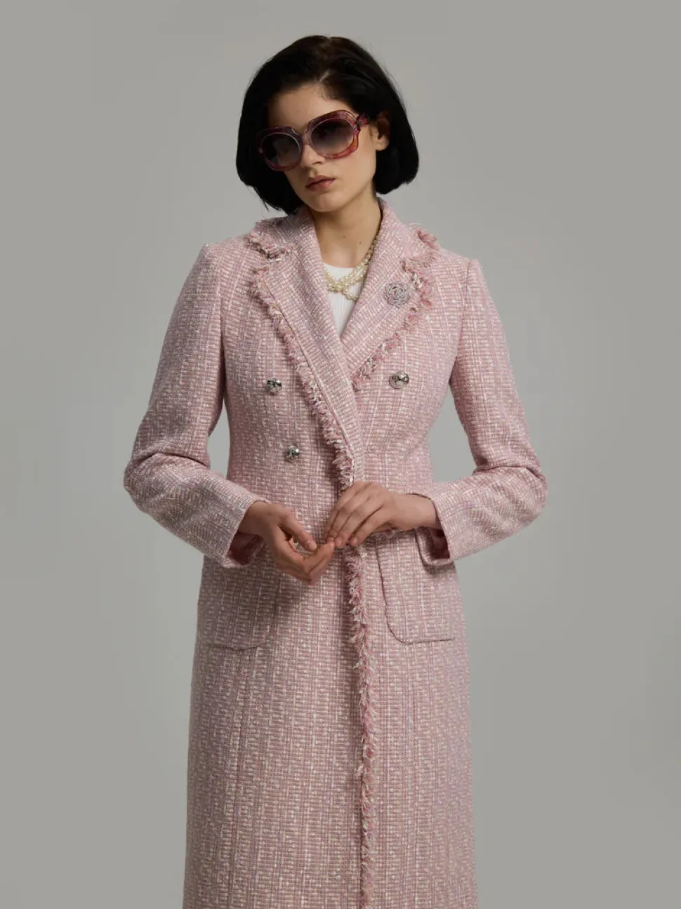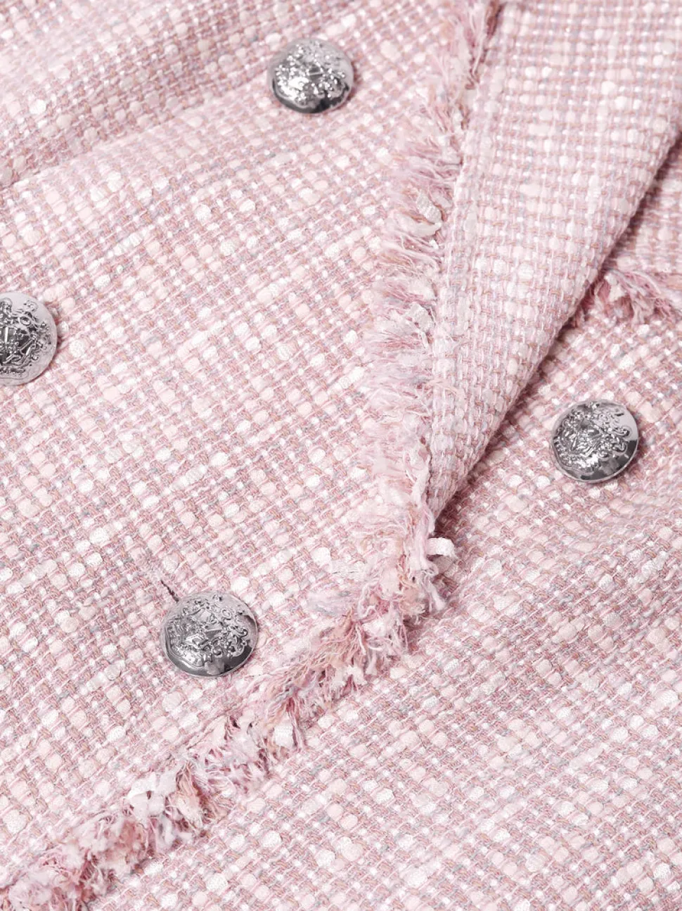 Bleiserimekko, joka on valmistettu italialaisesta bouclé-kankaasta. Klassinen, istuva kaksirivinen malli, jossa lovikaulus, hopeanväriset metallinapit, paikkataskut sekä koristeelliset hapsut reunoissa. Täysin vuorattu.
