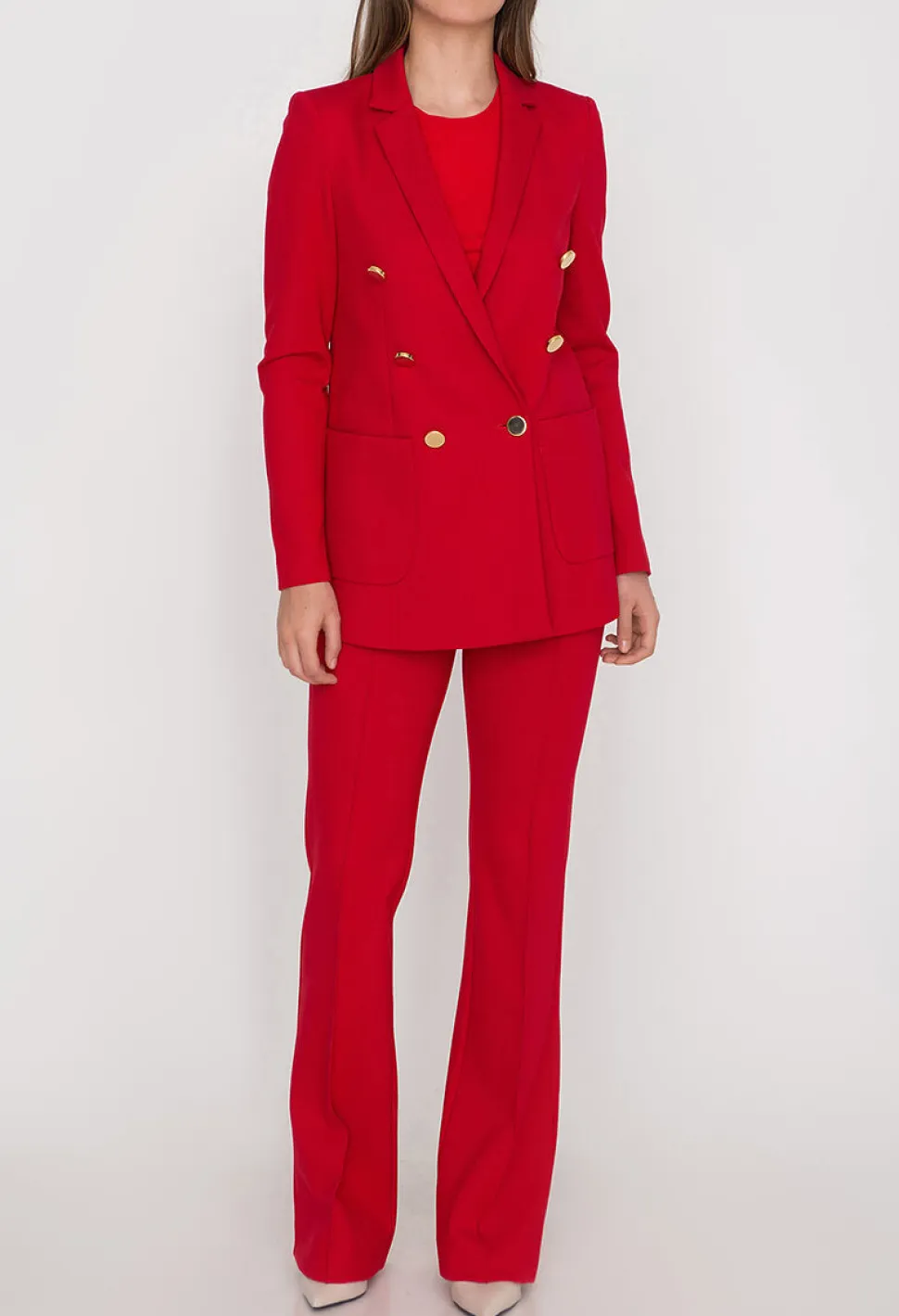 Andiata naisten tyylikäs bleiseri pidemmällä helmalla. Kultaiset napit kahdessa rivissä ja edessä paikkataskut. Joustava ja ryhdikäs kangas, joka tuntuu päällä miellyttävältä.
