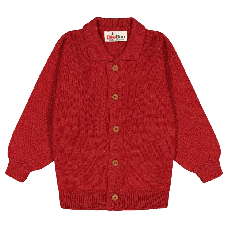 Lasten merinovillainen, yksivärinen neuletakki, jossa kääntökaulukset ja edessä napitus puisilla napeilla. Hihansuissa ja helmassa joustinneulosta.