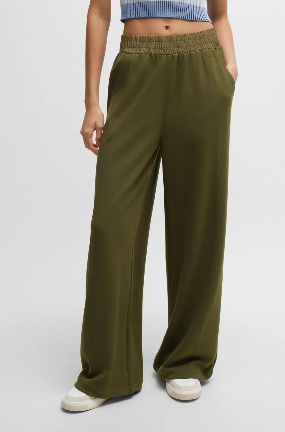 BOSS Womenswearin modernit housut, joissa on leveä lahkeensu. Tämä helppokäyttöinen housu on valmistettu pehmeästä joustavasta kankaasta, jossa on hienovarainen tuotemerkki.