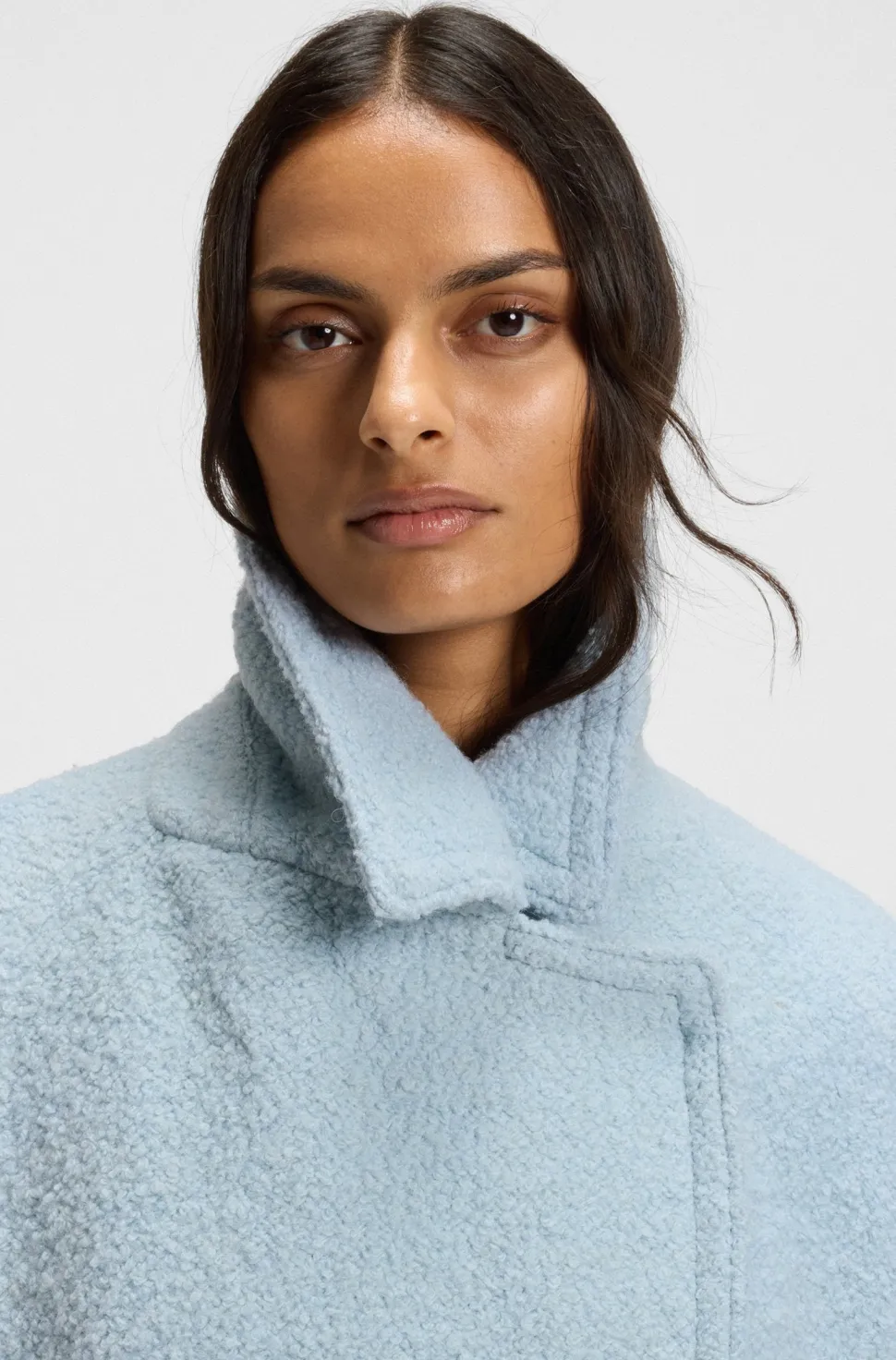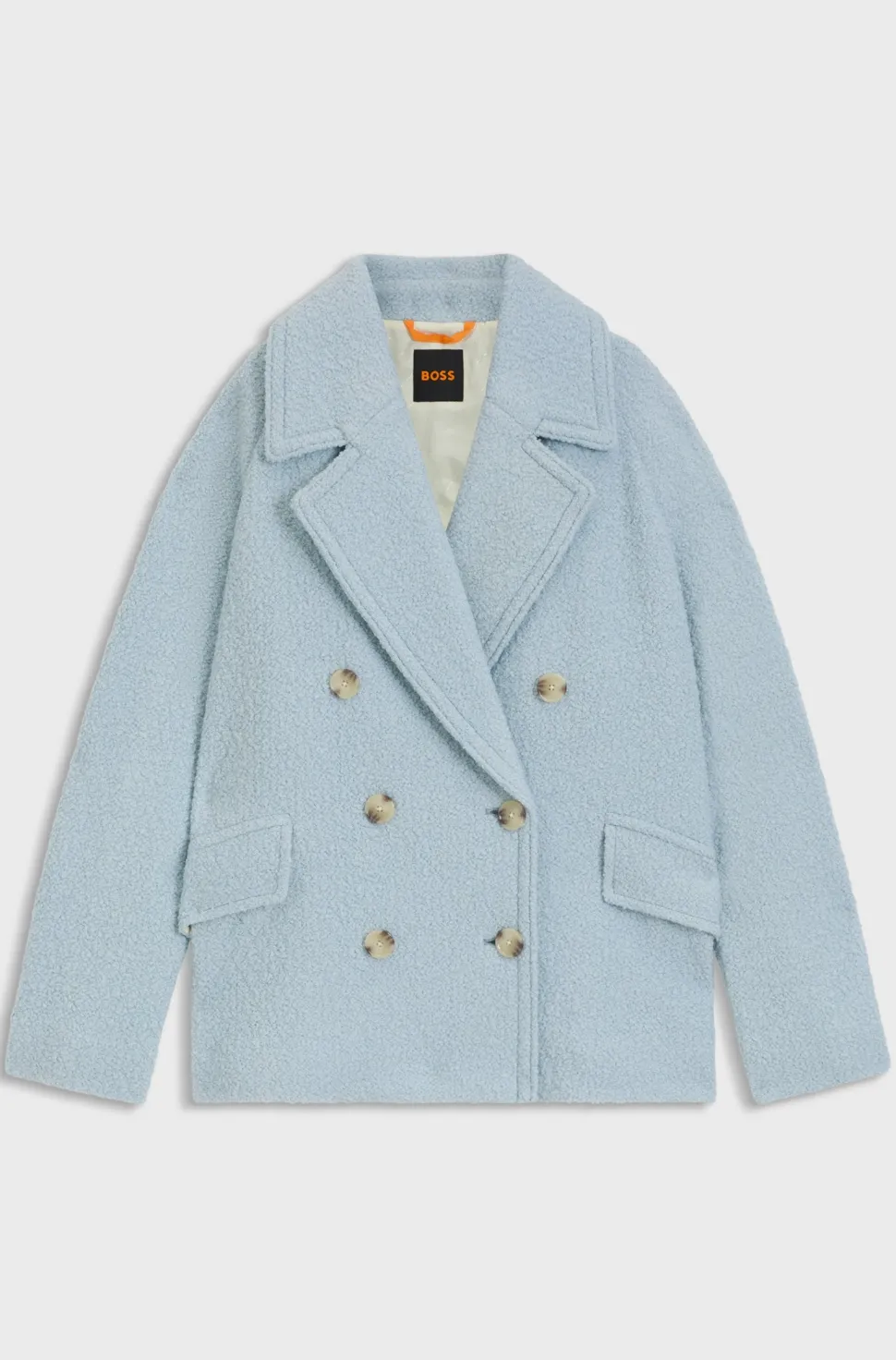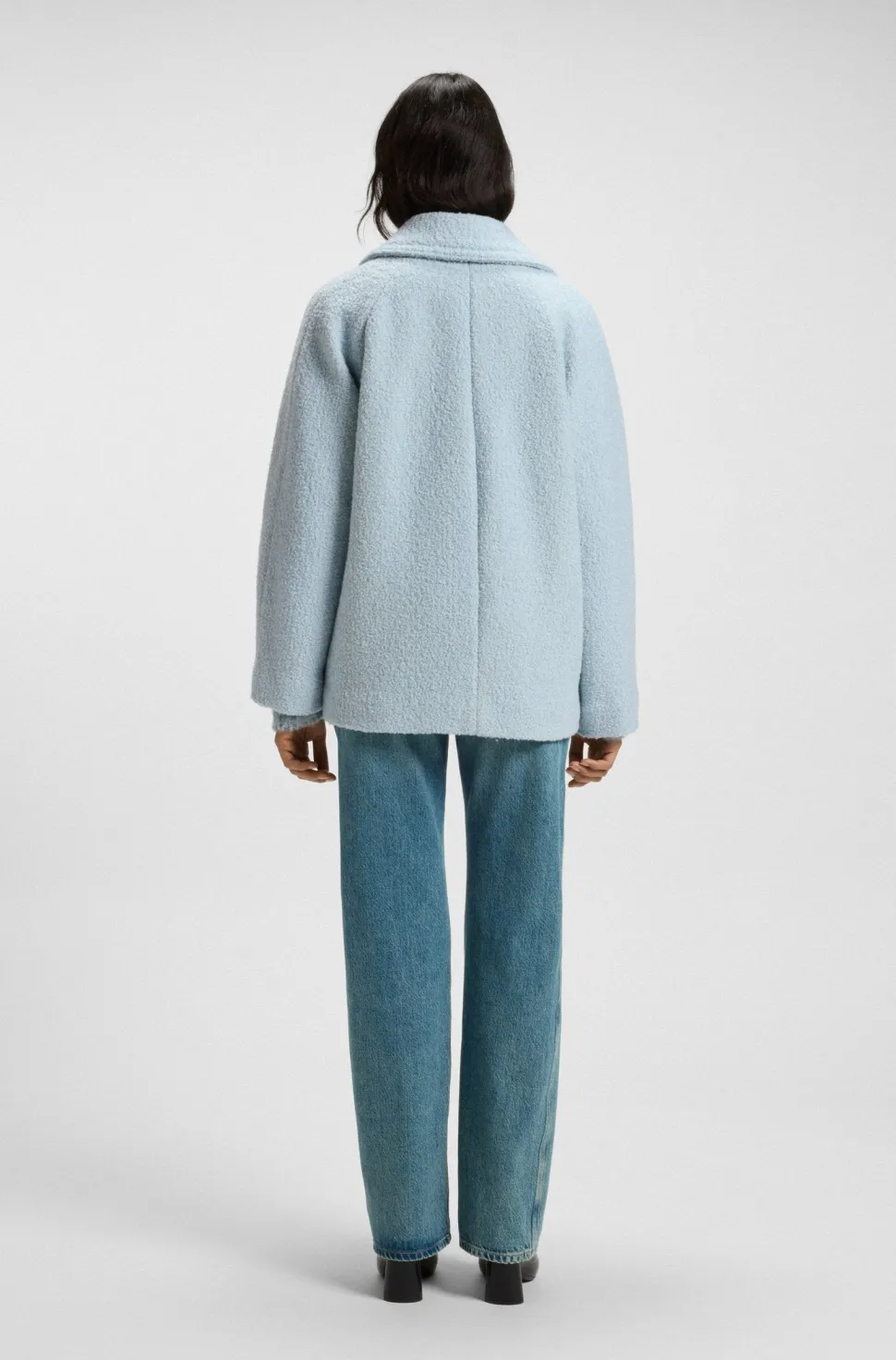 Tämä moderni naisten caban-takki yhdistää klassisen kuvion bouclé-rakenteeseen ja tuo päivitetyn ilmeen ajattomaan malliin. Suorakaiteenmuotoinen boxy-fit -malli ja kaksirivinen napitus korostavat minimalistista tyyliä, kun taas materiaaliseos – 60 % kierrätettyä polyesteriä ja 40 % villaa – tuo lämpöä ja kestävyyttä. Takissa on kaunista yksityiskohtaa myös sisävuorauksessa katsojalle hihansuiden ja niskan viimeistelyssä.