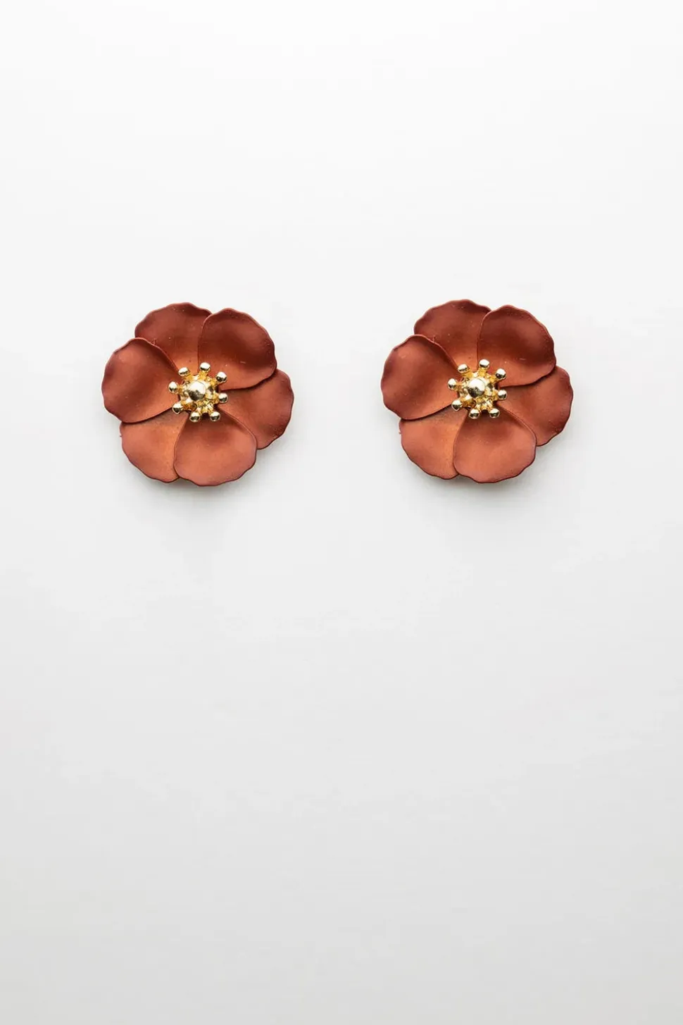 Bow19 kauniit ja suloiset kukka-korvakorut, joissa upean sävyiset terälehdet ja kullanvärinen keskusta. Korvakorun halkaisija on 2 cm.
