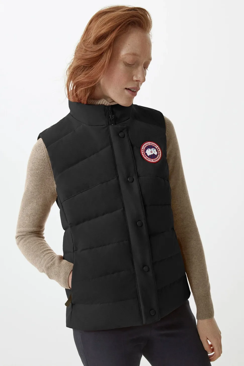 Canada Goose liivi. Välikauden suosikki päivitettynä naisellissa tikkauksella, pidemmällä takahelmalla ja pehmeillä kosketuspisteillä. Kauluksen takana heijastavat yksityiskohdat. Liivi tarjoaa monipuoliset mahdollisuudet kerrospukeutumiseen.