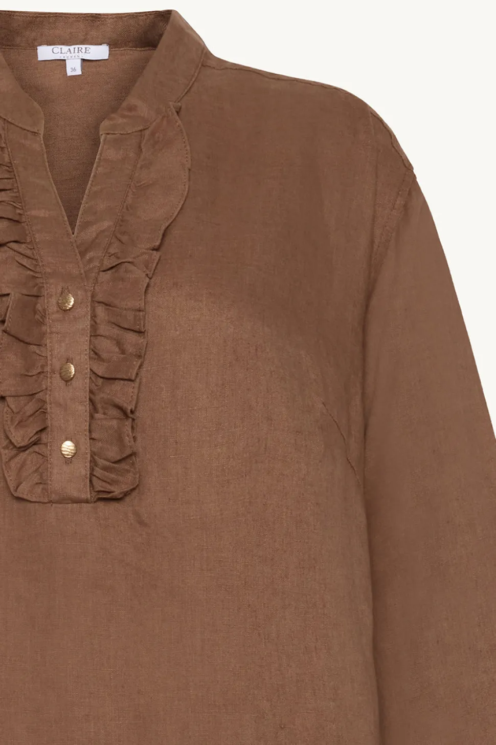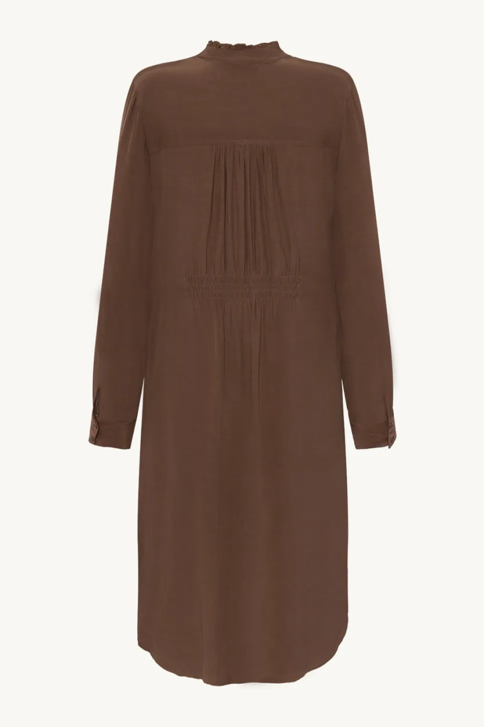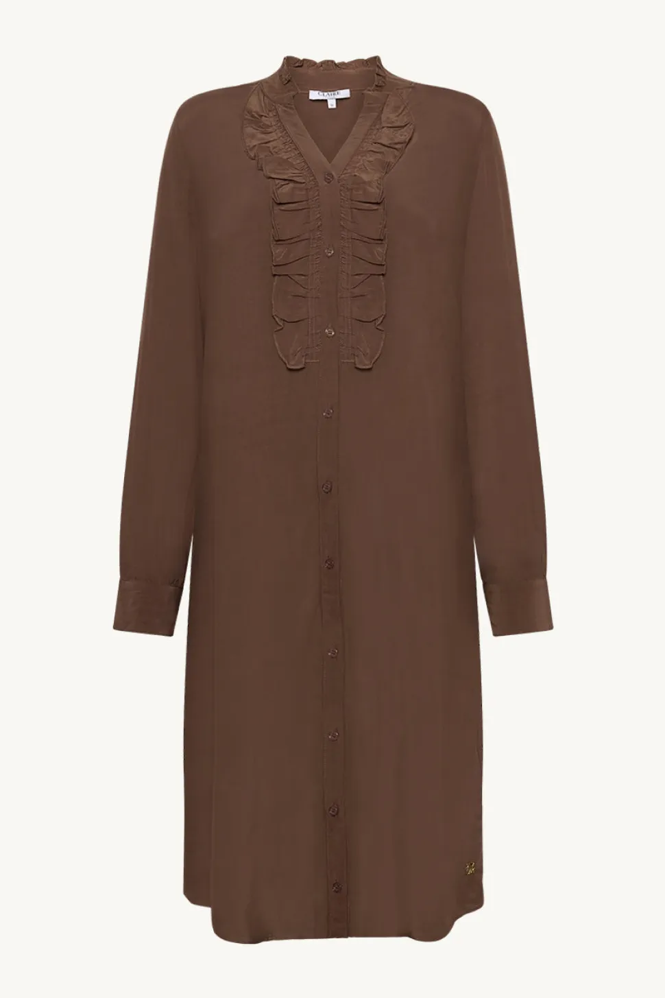 Clairen monikäyttöinen mekko, jossa on röyhelöyksityiskohtia edessä. Mekossa on hieman kaareva helma.