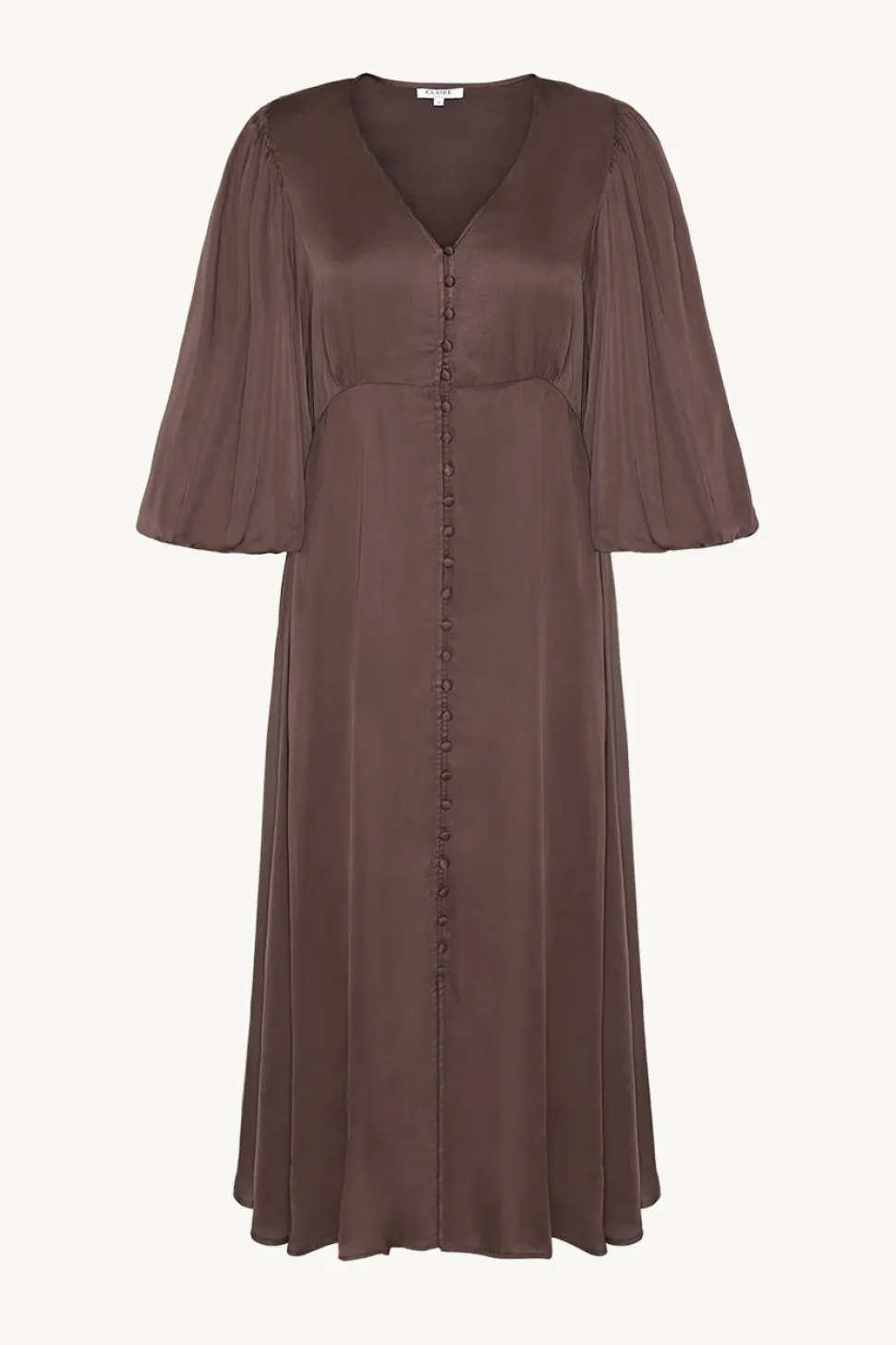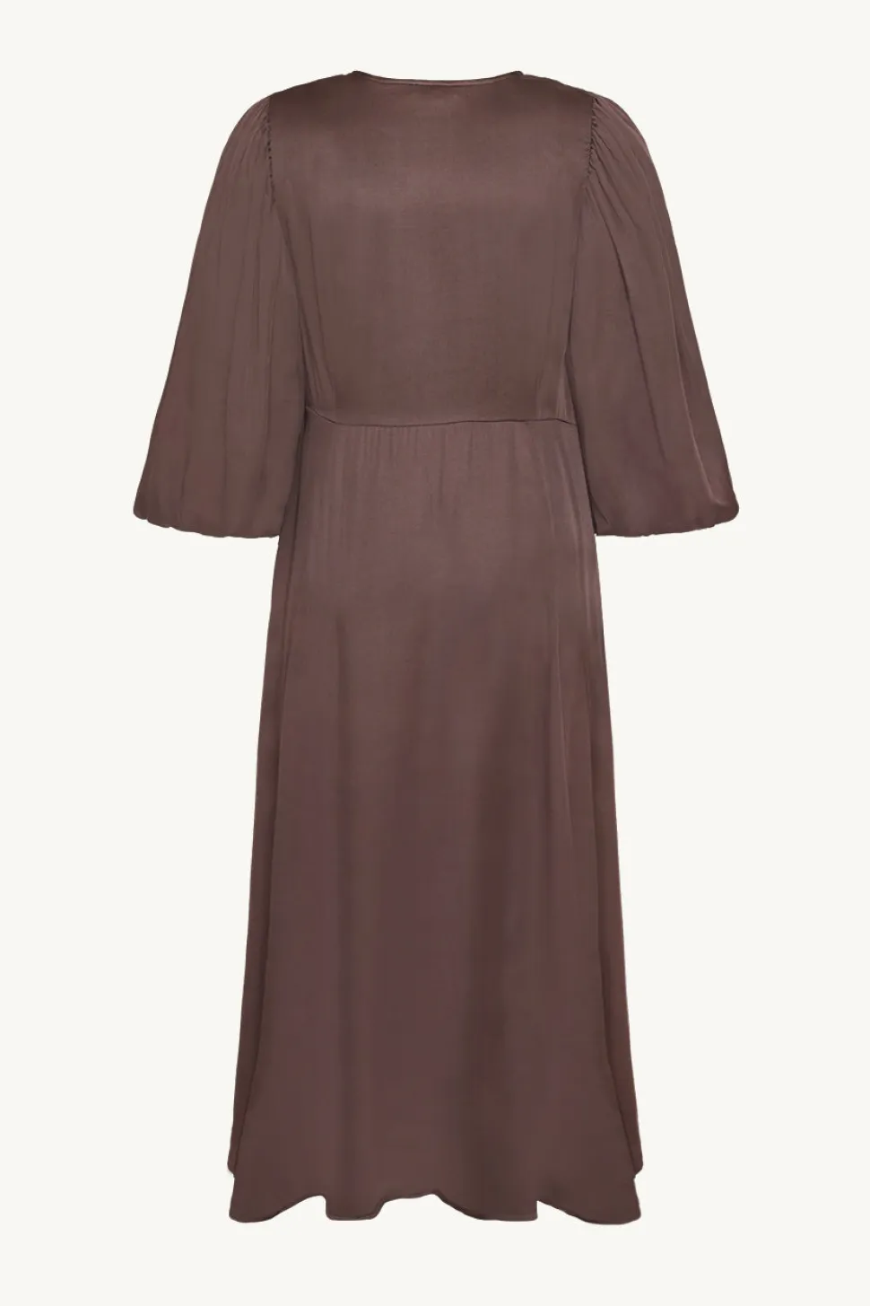 Anna juhla-asuusi eleganssia ja rohkeaa tyylikkyyttä—Claire Woman Dunia-mekko yhdistää lumoavan satiinin, kauniisti laskeutuvat volyymihihat ja naisellisen istuvuuden. Mekon yläosa on vartalonmyötäinen ja siinä on tyylikäs V-pääntie, joka korostaa kaula- ja decolté-aluetta. Leveä helma antaa kauniin, ilmavan liikkeen, ja napitus edessä lisää sävykkään detaljin, johon kuuluu lisäksi pieni halkio helman alaosassa. Napit on yhdistetty joustavaan kuminauhalenkkijärjestelmään, joka tekee pukemisesta helppoa ja mukavaa. Volyymihihat ovat muotoiltu niin, että ne näyttäisivät puhvihihallisilta, mutta laskeutuvat elegantisti ja miellyttävästi—täydellinen yhdistelmä näyttävyyttä ja käytännöllisyyttä. Kevyt viskoosivuori takaa miellyttävän tunnun ja sulavan liikkeen mekossa