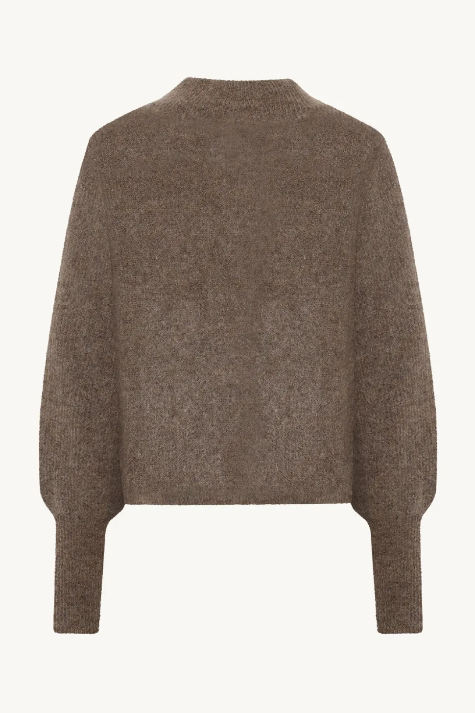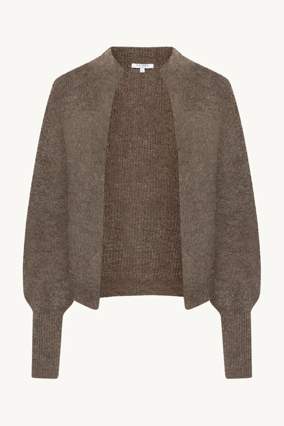 Naisten jakkumainen neuletakki pehmeää, joustavaa mohairia. Lyhyt, vyötärölle ulottuva malli, pallohihat, pitkät resorit hihansuissa.