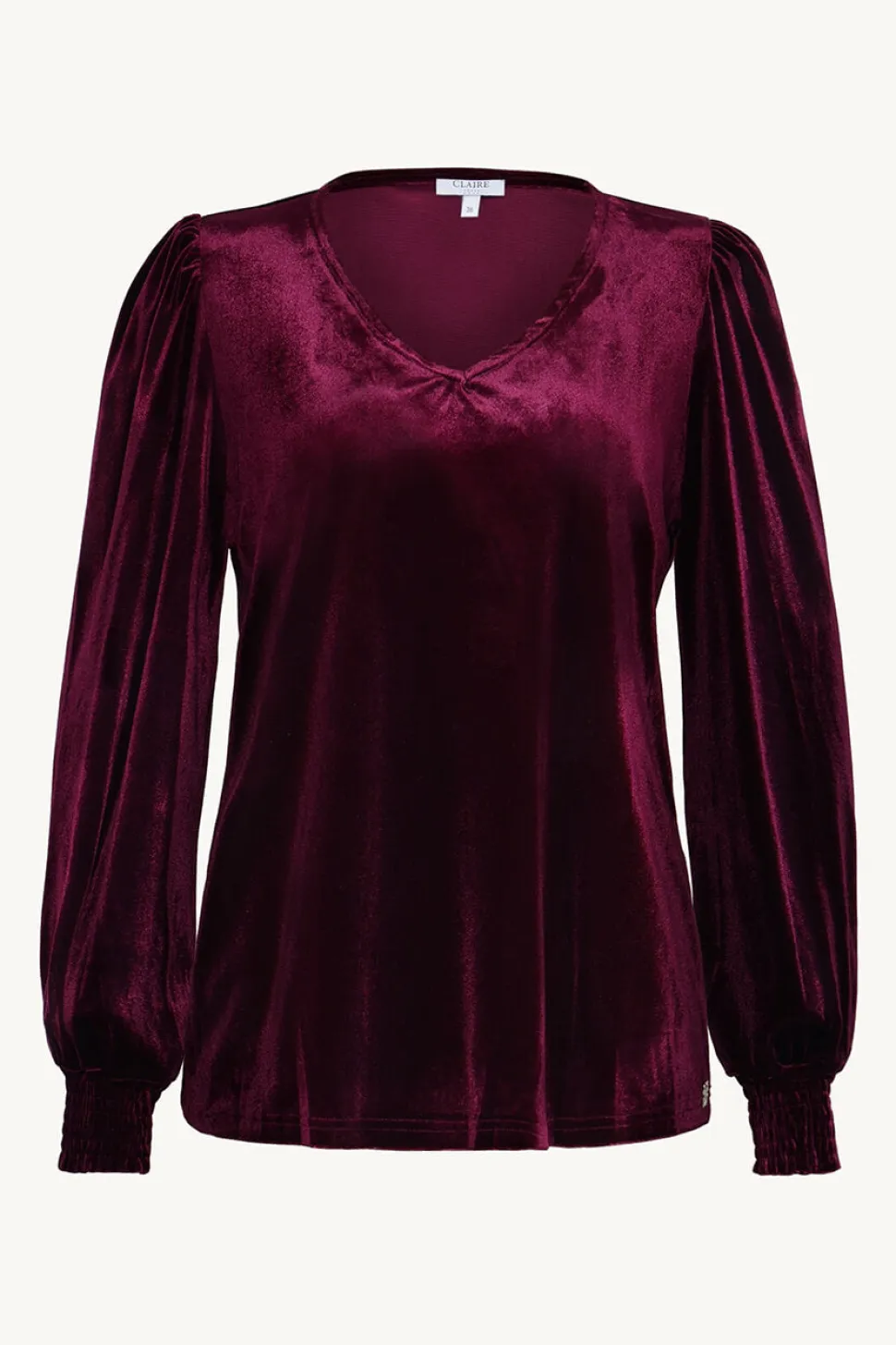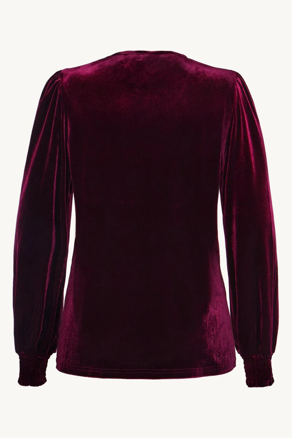 V-pääntiellä varustettu pusero, valmistettu pehmeästä ja joustavasta veluurista. Olkapäillä on tyylikkäät laskokset, ja hihansuut on viimeistelty joustavalla smokkirypytyksellä.