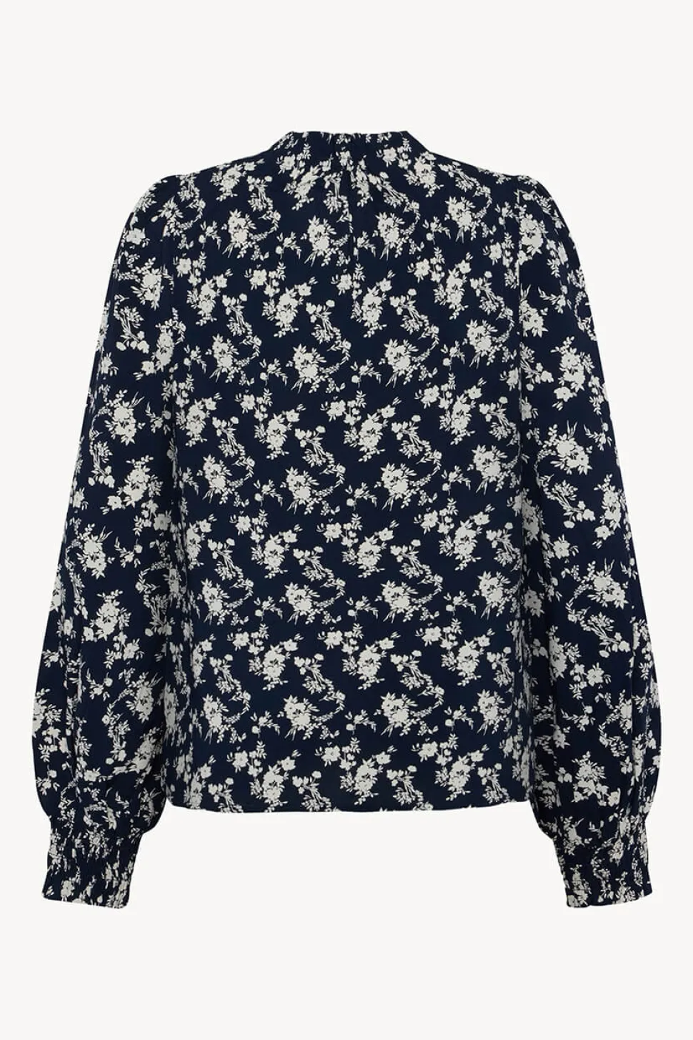 Paita kudottua viskoosia, jossa on kukkakuvio, laskokset ja nappikiinnitys niskassa. Paidassa on laskokset olkapäillä ja resori hihoissa sekä halkiot sivuissa.