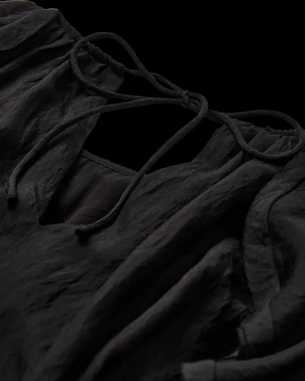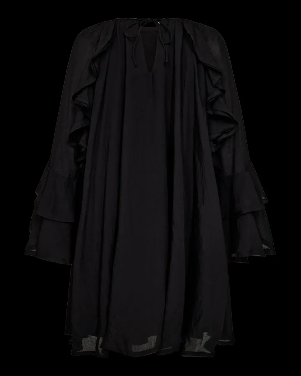 Copenhagen Muse NORMA DRESS on lyhyt mekko laadukkaasta, hieman läpikuultavasta materiaalista. Mekko on kokonaan vuorattu ja siinä on halkio sekä nauhakiinnitys niskassa. Pitkät, leveät hihat saa säädettyä kiristysnyörillä. Mekko on loose fit -mallia, eli väljähkö ja mukava päällä.