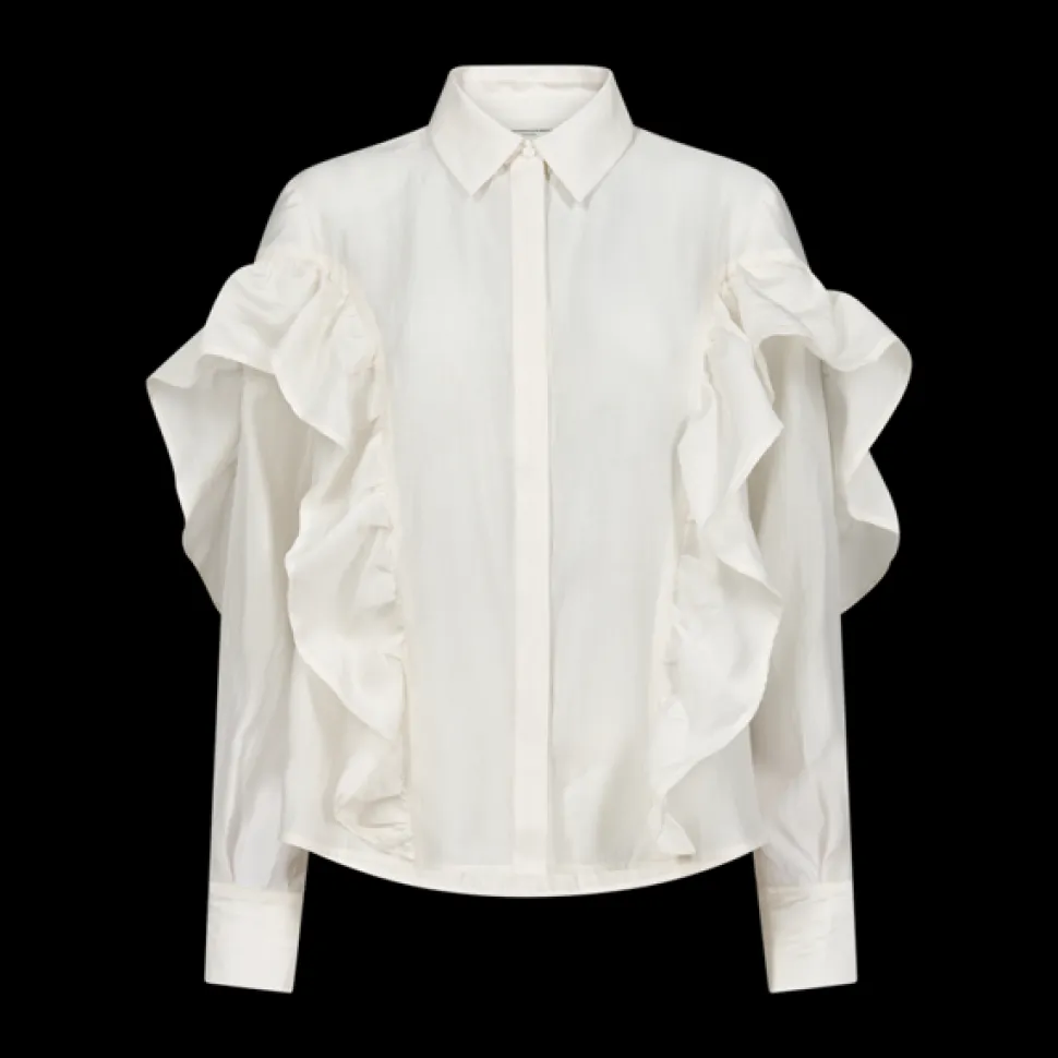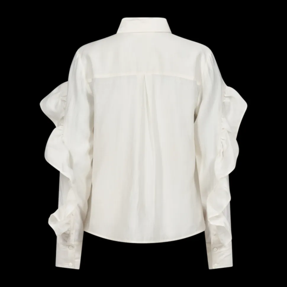 CMMOLLY-PAITA on ensiluokkaisesta materiaalista valmistettu paita, jossa on piilonapitus edessä, siro kaulus ja pitkät hihat, joissa on elegantit, suuret röyhelöt.
