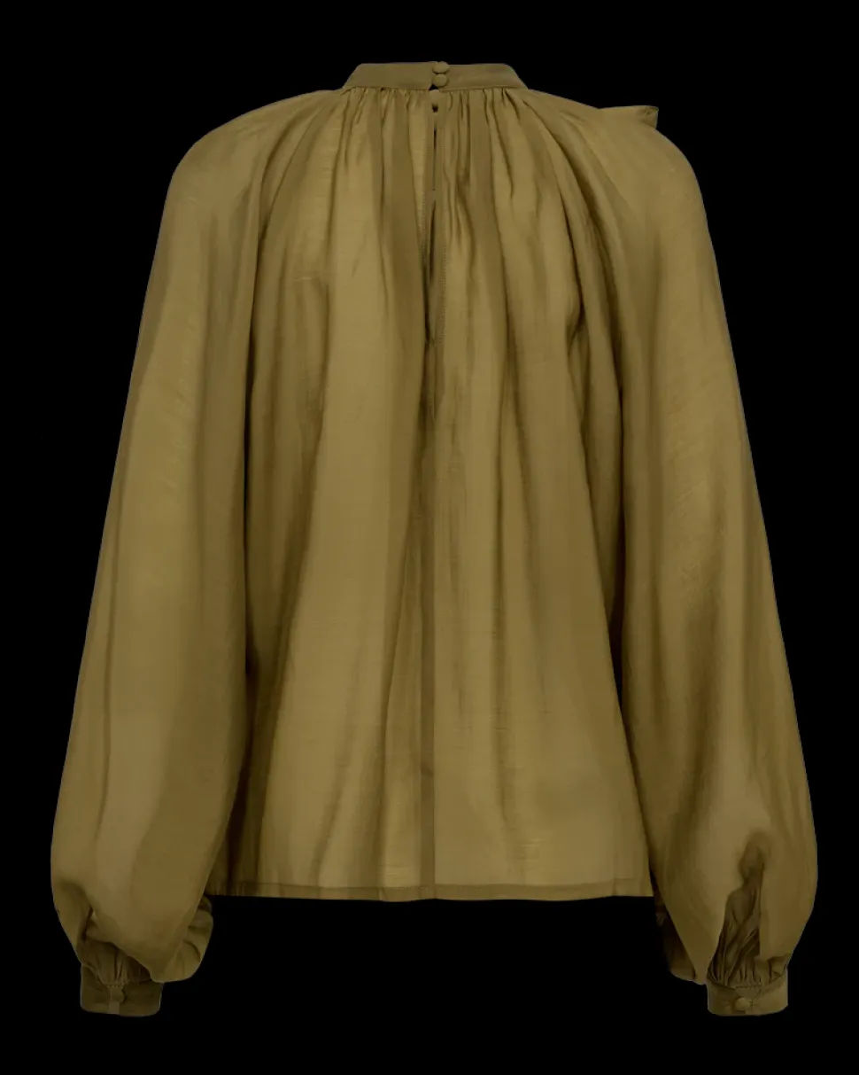 CMTILLY-BLOUSE on eksklusiivinen pusero, jossa on ylellinen, irrotettava rusettikoriste korkeassa kauluksessa, laskostetut yksityiskohdat, kangasnapeilla koristeltu halkio takana ja pitkät raglanhihat, joissa on runsas ilmapalloefekti ja nappikiinnitys.