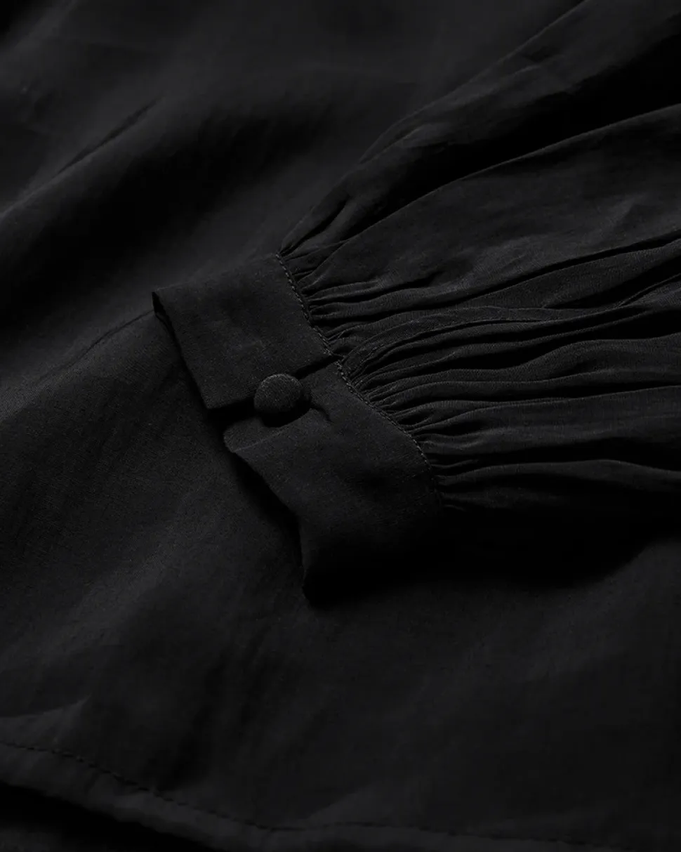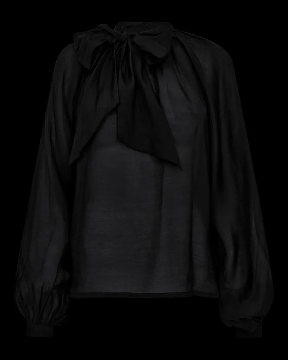 CMTILLY-BLOUSE on eksklusiivinen pusero, jossa on ylellinen, irrotettava rusettikoriste korkeassa kauluksessa, laskostetut yksityiskohdat, kangasnapeilla koristeltu halkio takana ja pitkät raglanhihat, joissa on runsas ilmapalloefekti ja nappikiinnitys.