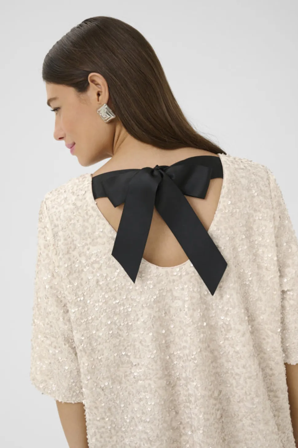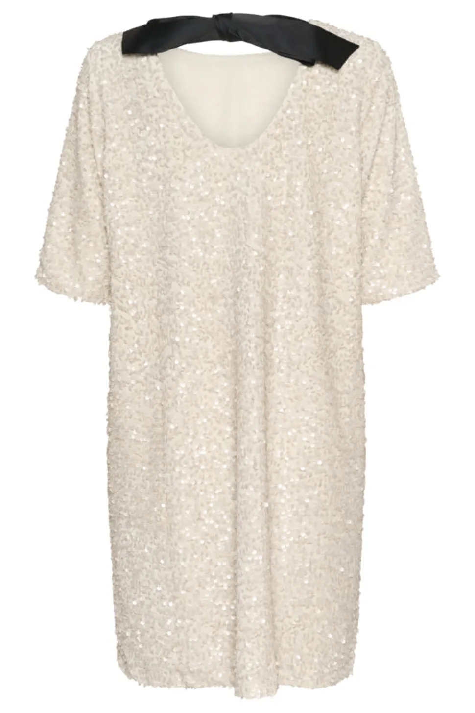 Paljettikoristeinen mekko kiinnittää huomion suoralla siluetillaan, polven yläpuolelle ulottuvalla pituudellaan, pyöreällä pääntiellään ja kyynärpäähän ulottuvilla hihoillaan. Viimeisteltynä kontrastivärisellä nauhayksityiskohdalla takana niskassa luomaan katseenvangitsevan yksityiskohdan.