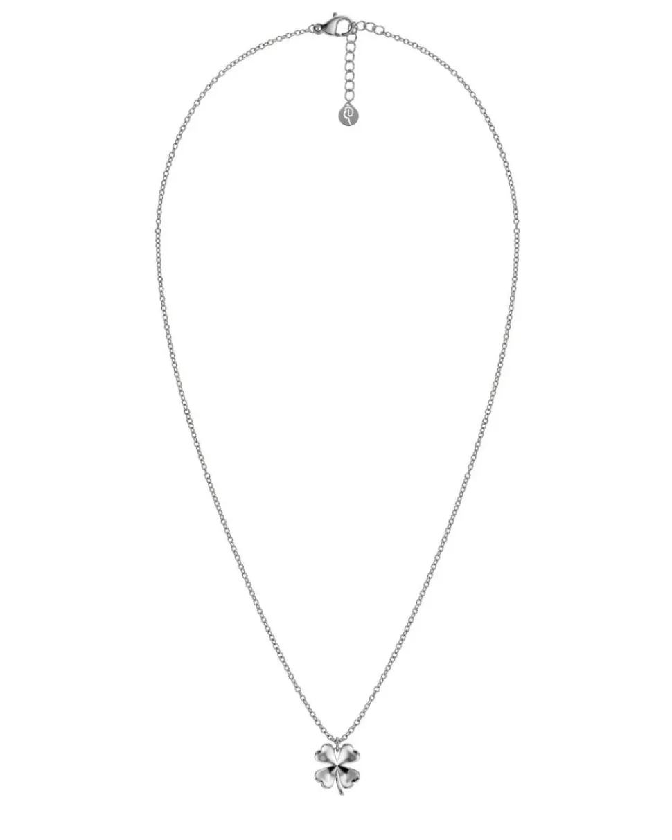 Tämä kaulakoru on valmistettu kiiltävästä ruostumattomasta teräksestä ja sisältää nelilehtisen apilan, joka symboloi onnea ja iloa. Riipuksen mitat ovat 11 × 12 mm ja ketjun pituus säädettävissä välillä 45–48 cm. Koru on nikkeliturvallinen ja vedenkestävä.