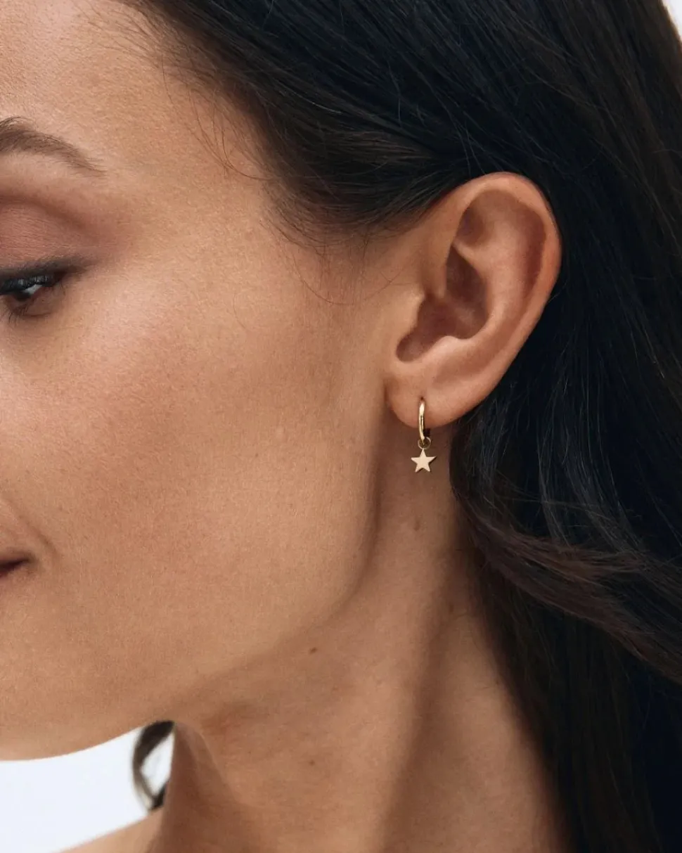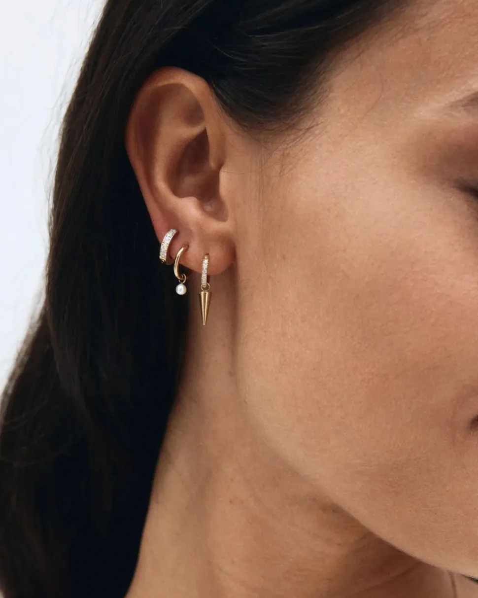 Tyylikäs Peak-korvarengassarja, tässä 14 karaatin kultauksella, koostuu neljästä yksittäisestä korvakorusta irrotettavilla riipuksilla. Niitti rungossa, jossa on kimaltelevia kiviä, helmi ja tähti kiiltävillä rungoilla sekä rengas, jossa on kimaltelevia kiviä ilman riipusosaa. Todella trendikkäät korvakorut niille, joilla on useita korvareikiä.