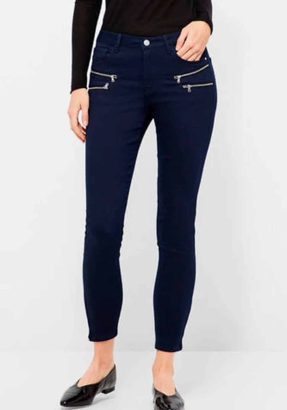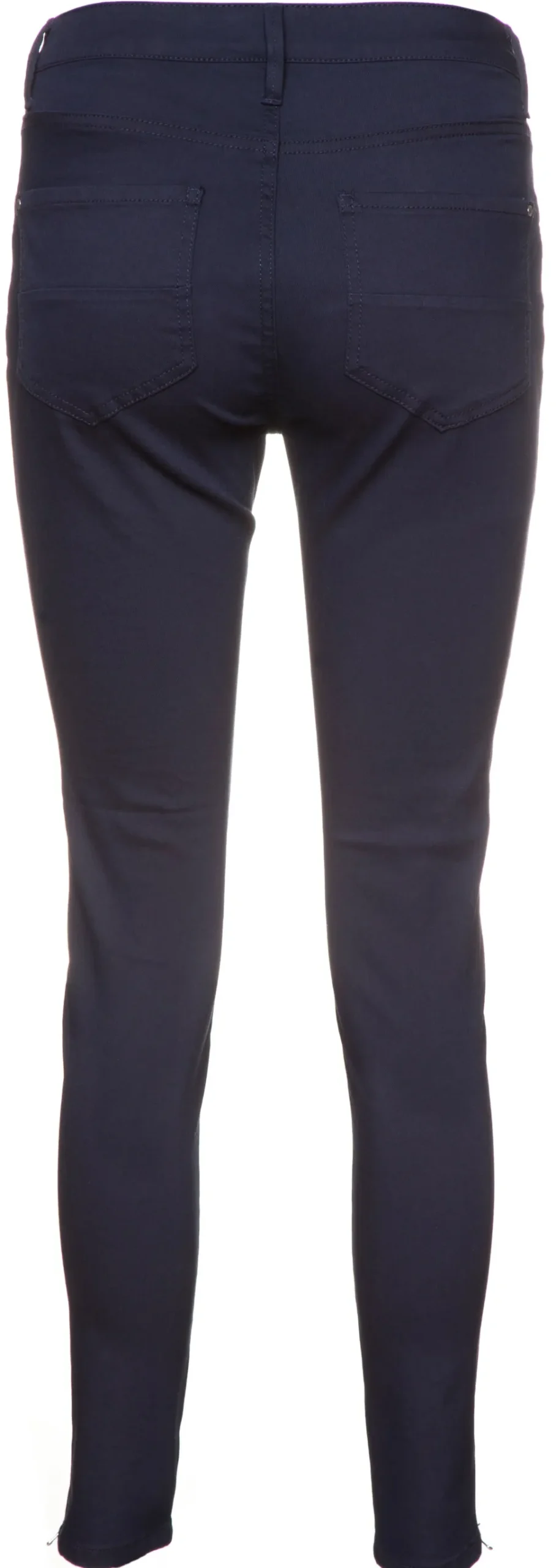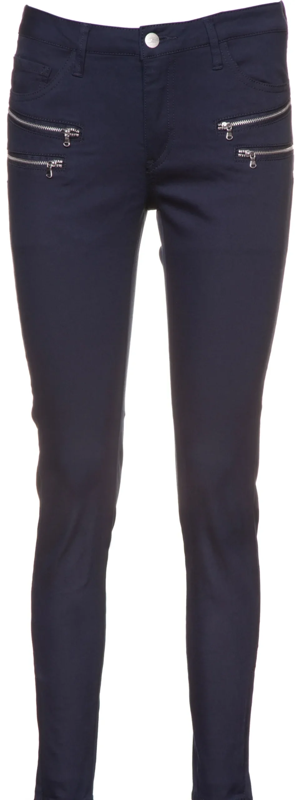 Freequentin huolettomat, kapeat housut 7/8-lahkeilla. Normaali vyötärönkorkeus, edessä hopeanvärisiä koristevetoketjuja. Lahkeensuissa lyhyet vetoketjut.
