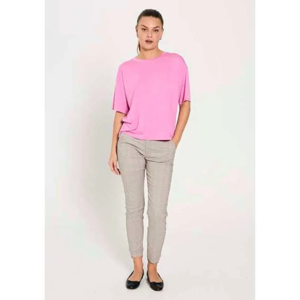 Freequentin housut pehmeästä ja joustavasta materiaalista, jossa ruudullinen printti. Housuissa on yksinkertainen siluetti vetoketjulla ja nappikiinnitys, vinot sivutaskut, kapea istuvuus ja halkio nilkkapituisissa housujen lahkeissa.