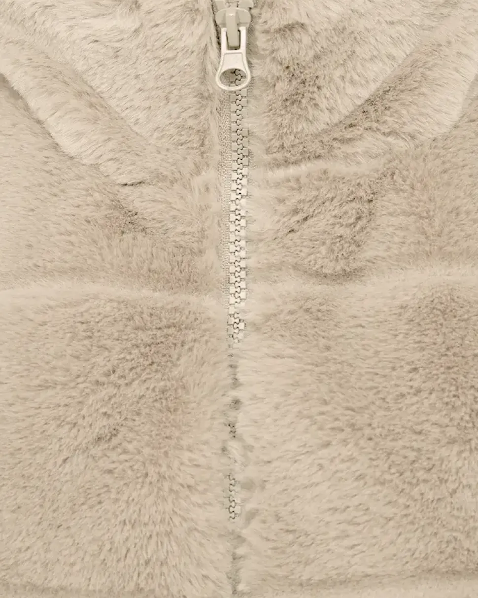 Liivissä on yksinkertainen siluetti, edessä vetoketjukiinnitys, suora leikkaus ja korkea kaulus.