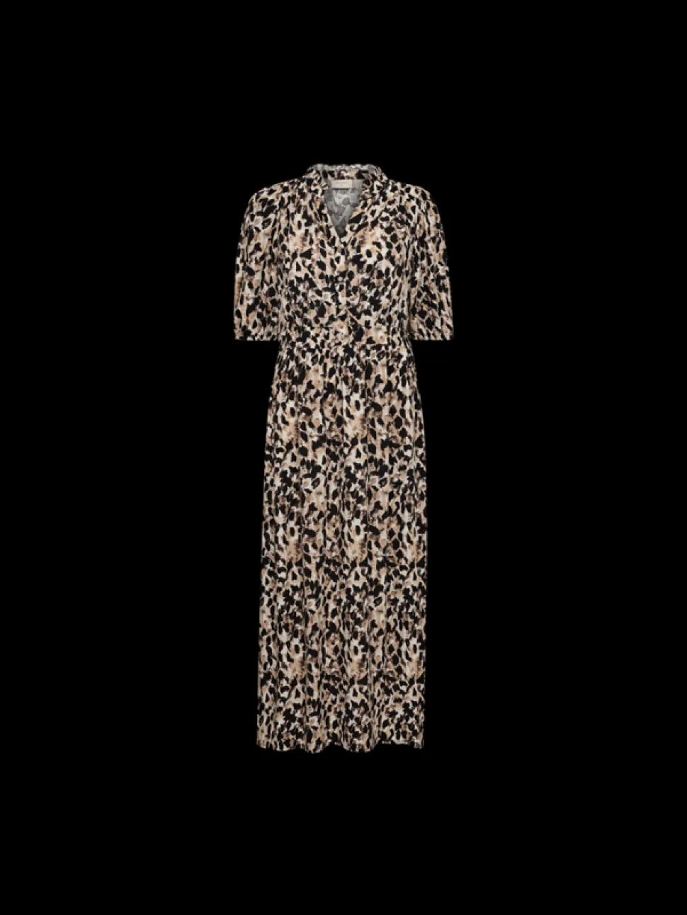 Freequent-maksimekko pehmeää materiaalia, jossa painatus. Mekossa on lyhyet ilmapallohihat, V-pääntie ja röyhelöinen kaulus, edessä nappikiinnitys ja smokki selässä korostamaan vyötäröä.