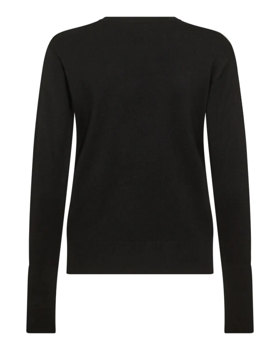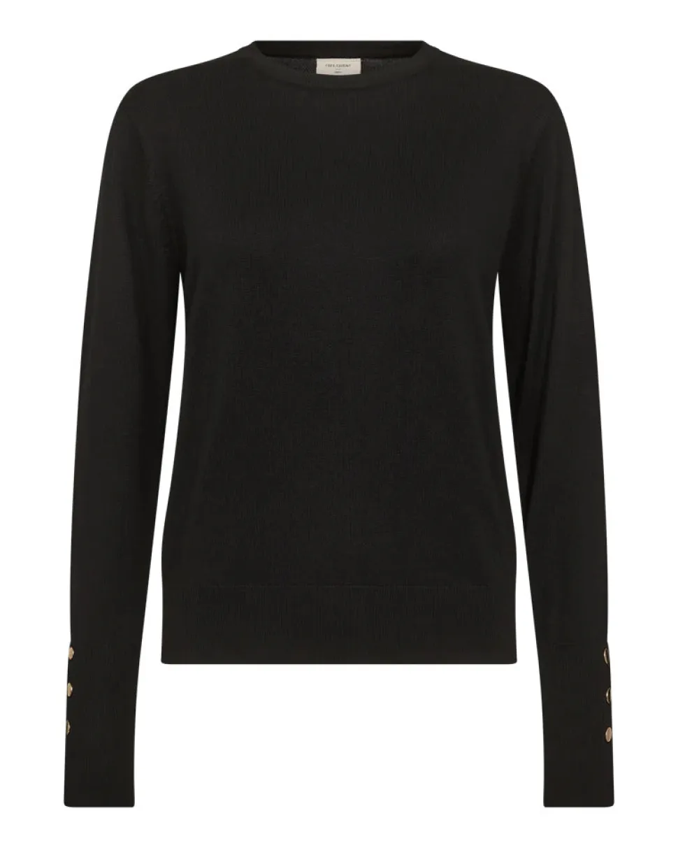 Neulepusero pehmeästä, hienoksi neulotusta materiaalista. Neulepuserossa on yksinkertainen siluetti rennolla istuvuudella, pyöreä kaula-aukko, resorit sekä pitkät hihat koristelluilla napilla..