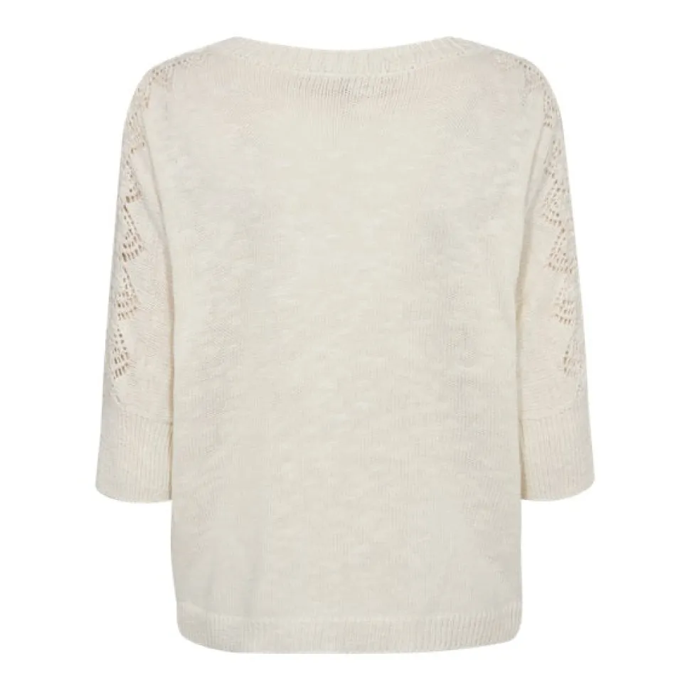 Koristeellinen pullover neule, jossa on v-pääntie ja vajaamittaiset 3/4-hihat. Olalta hihoihin kulkee kaunis pitsikuviointi.