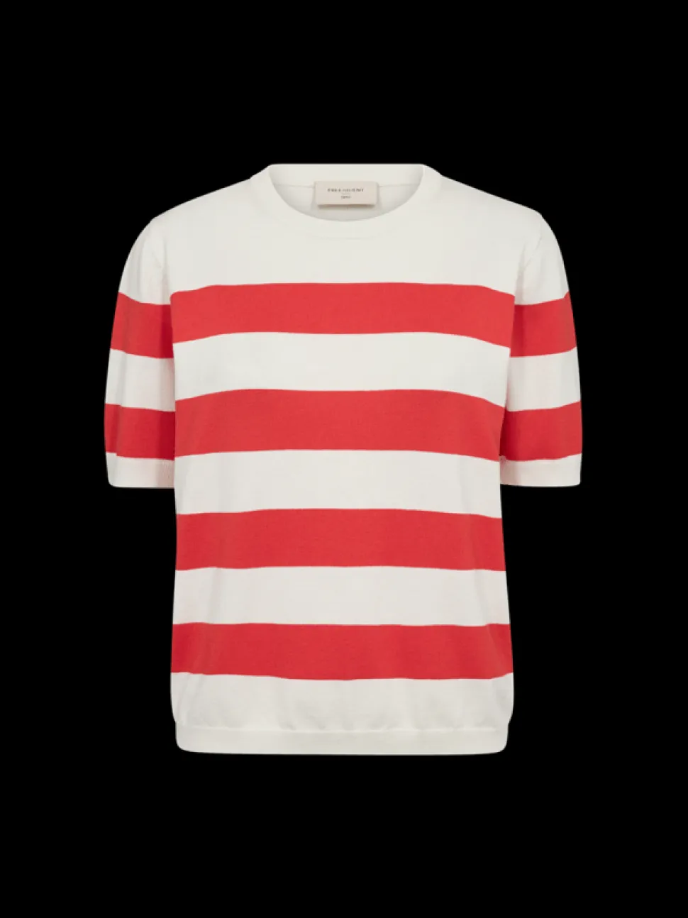 Freequent-neulepusero pehmeää, ohutta materiaalia, jossa on leveä raidallinen kuvio. Neulepuserossa on yksinkertainen siluetti, lyhyet hihat, pyöristetty pääntie, resori ja tyylikäs, rento malli.