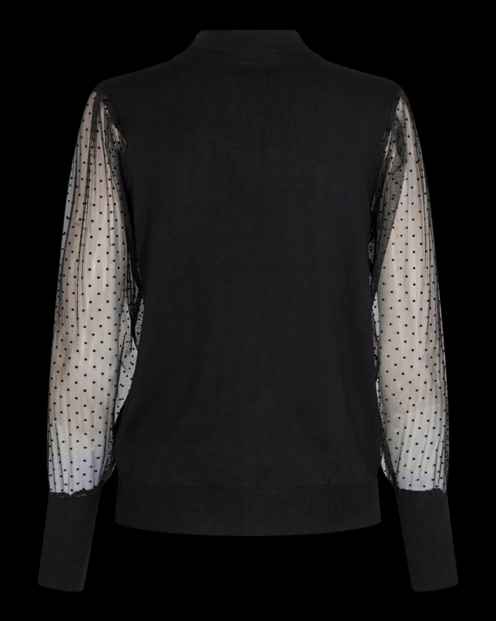 Naisten juhlava neule pehmeää viskoosia. Sifonkihihat on pussimaiset läpikuultavat ja niissä on pilkkukuvio. Kaulus on kevyesti puolikorkea.