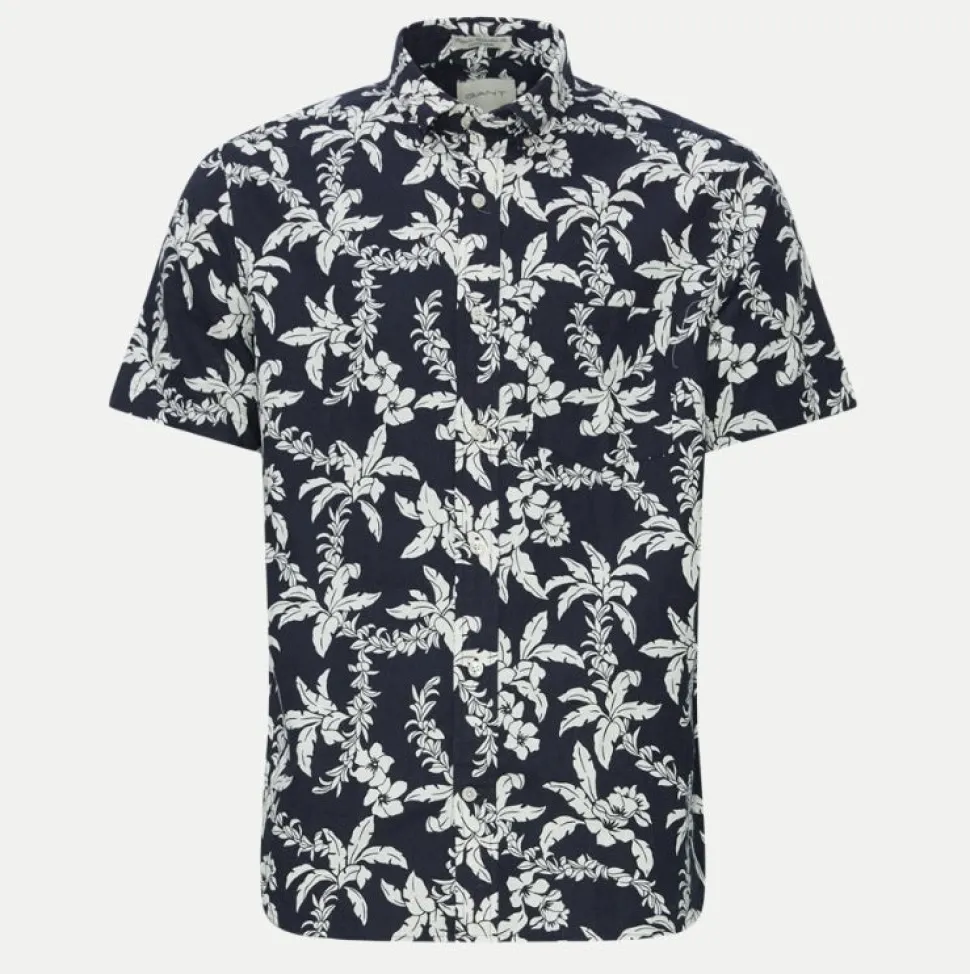 Gantin lyhythihainen kauluspaita palmukuvioinnilla. Täydellinen valinta kesään kevyen pellavasekoitteisen materiaalinsa ansiosta! Regular fit istuvuus ja rintatasku.