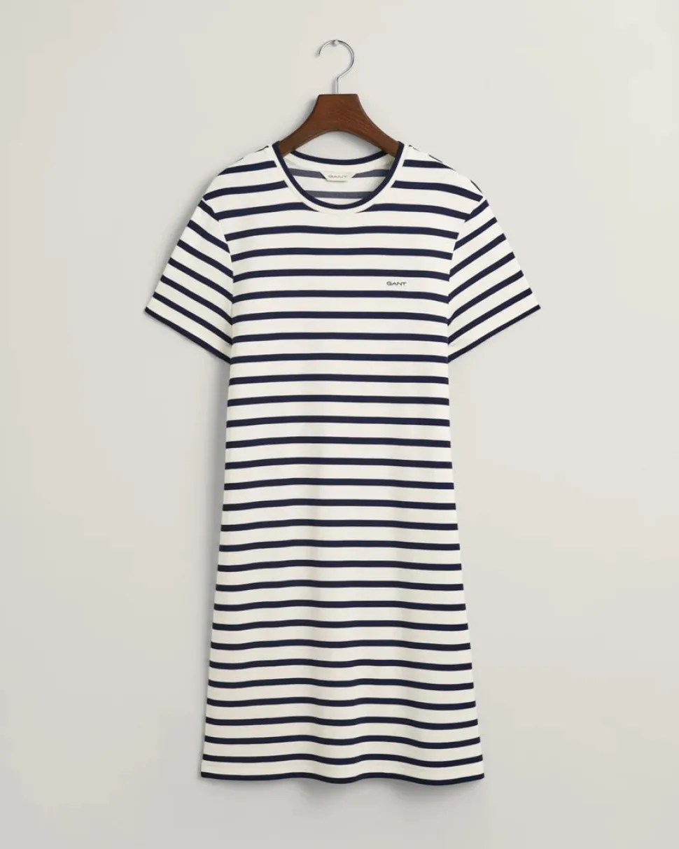 Yksinkertaisen tyylikäs raidallinen paitamekko. Rinnassa Gant -logo.