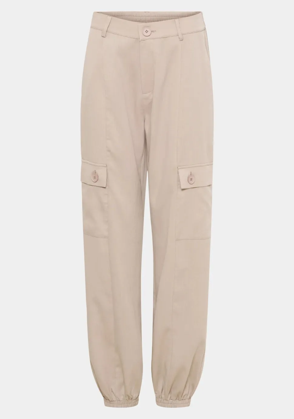 Edessä viistotaskut ja muodikkaat reisitaskut. Housuissa on vyölenkit ja vyötärönauha on takaa joustava. Lahkeensuut on myös joustavat.
