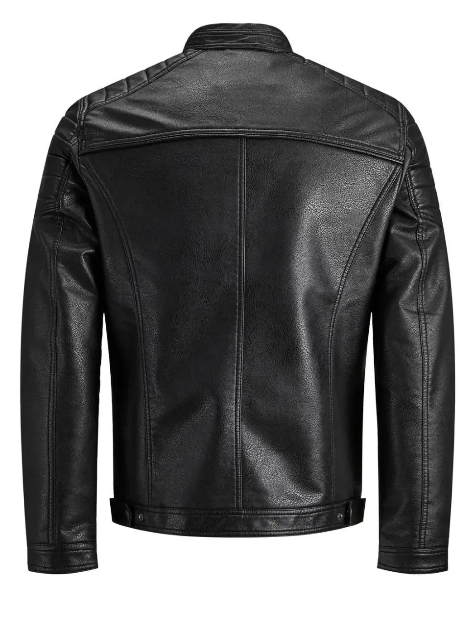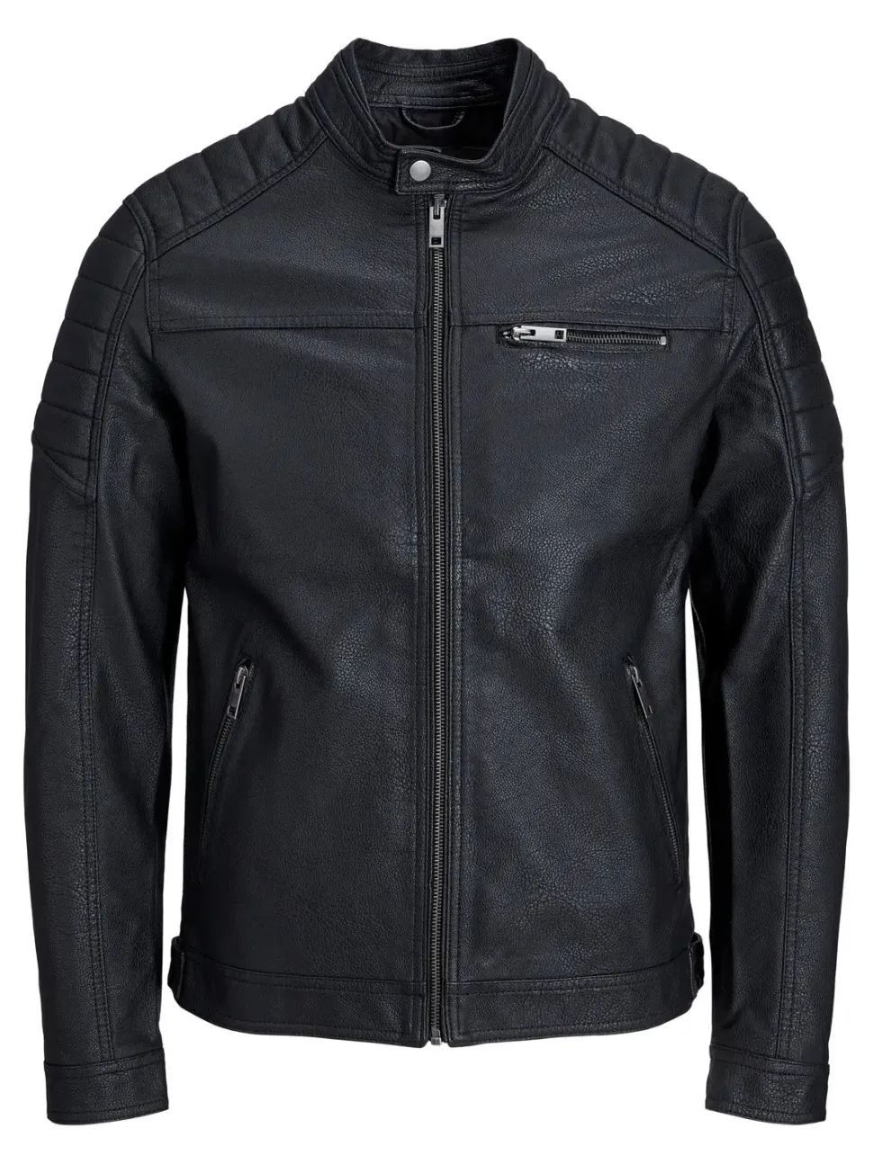Jack&Jonesin tyylikäs, kaulukseton keinonahkatakki. Vetoketjukiinnitys, kolme vetoketjullista taskua. Malli on 187 cm pitkä ja päällä on L-koko.