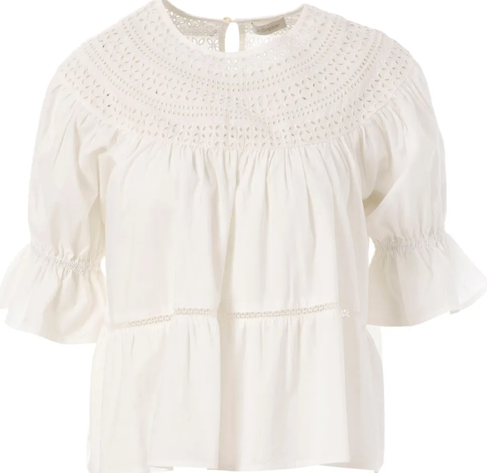 Kaunis naisten paitapusero. Kangas on kevyt ja upeasti laskeutuva. Reikäyksityiskohdat pääntiellä ja vyötäröllä tuovat romanttisuutta puseroon.