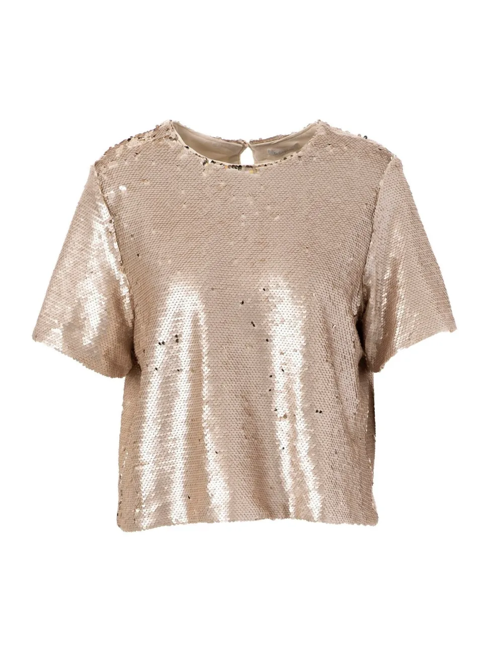 Pusero on täysin koristeltu paljeteilla ja onkin loistokas valinta juhlaan. Puserossa on pyöreä pääntie ja takaa löytyy pieni halkio napilla.