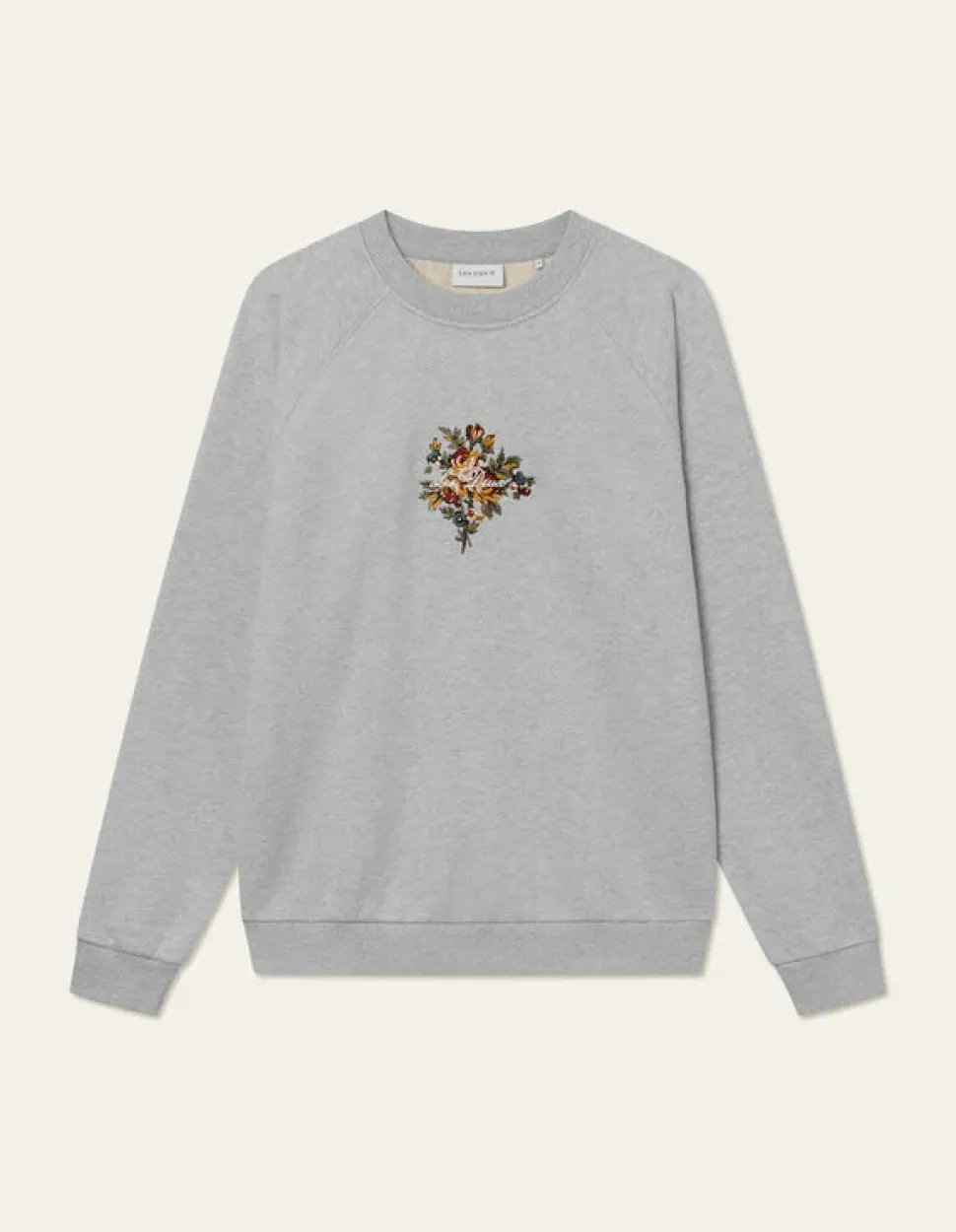 Normaalisti istuva collegepaita erittäin raskaasta 550 GSM:stä, jossa raglanhihat ja brodeerattu kukkakuvioinen tekstitaide rinnassa.