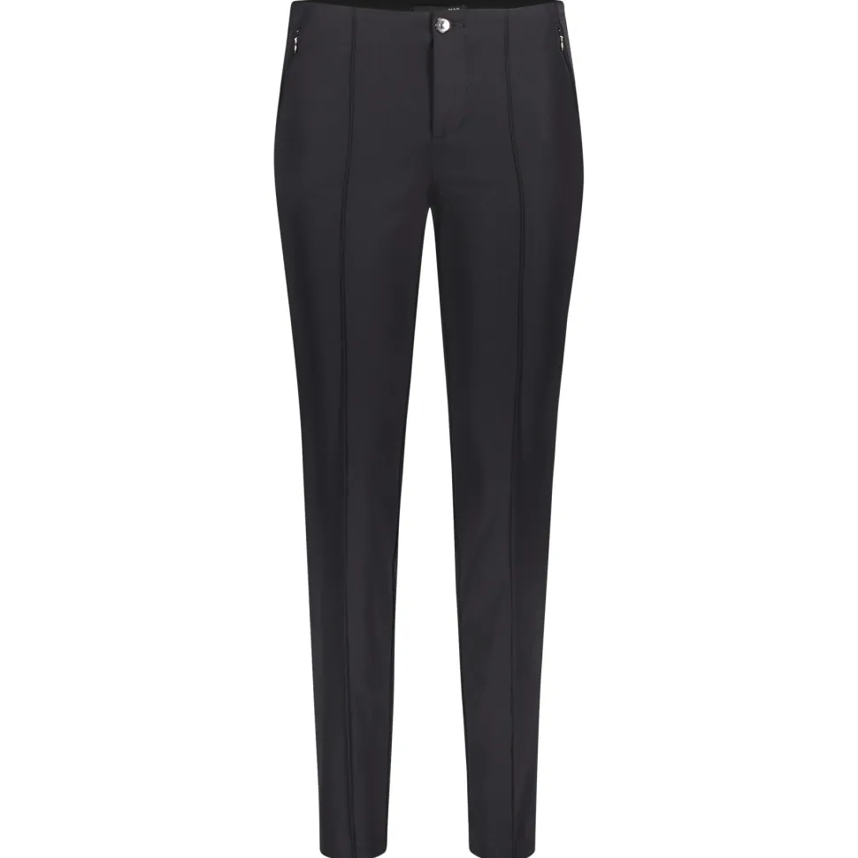 MAC naisten siistit housut, joissa normaali vyötärönkorkeus. Erittäin joustava materiaali tekee housuista helppokäyttöiset ja miellyttävät päällä. Vyötäröllä leveä kuminauha, ei vyönlenkkejä. Edessä nappi ja vetoketjukiinnitys. Kapeat suorat lahkeet, joissa edessä päälleommellut prässit. Vetoketjulliset taskut edessä, takana koristetaskut. Lahkeensuu 30 cm.