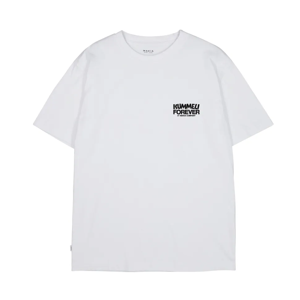 Kummeli Forever by Makia -malliston puuvillainen t-paita, jossa takana näyttävä tekstiprintti Kummeli Forever sekä printti edessä rinnassa. Paidassa pyöreä pääntie ja lyhyet hihat.