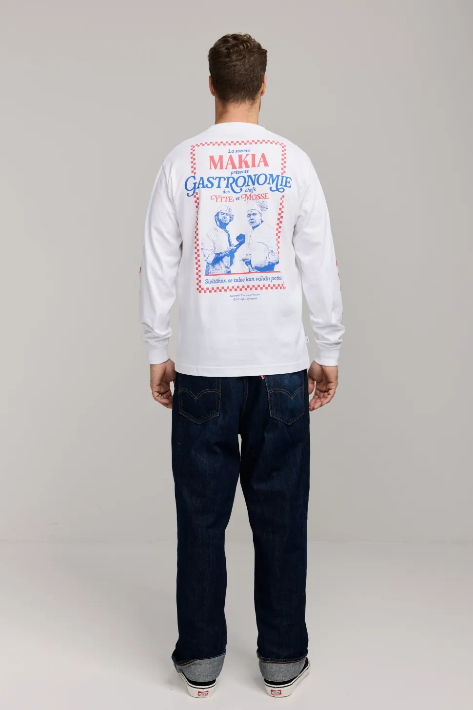 Kummeli Forever by Makia -malliston puuvillainen pitkähihainen t-paita, jossa printti rinnassa ja hihoissa sekä näyttävä Gastronomie –printti selässä. Paidassa pyöreä pääntie ja pitkät hihat. Hihansuissa ja pääntiellä joustavat resorit.