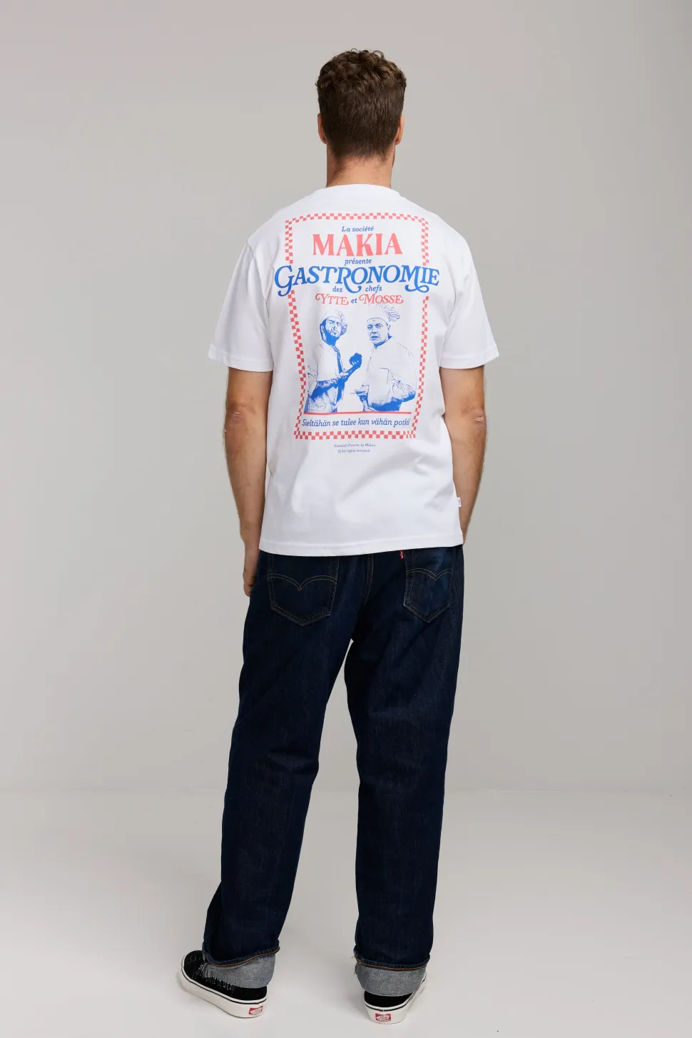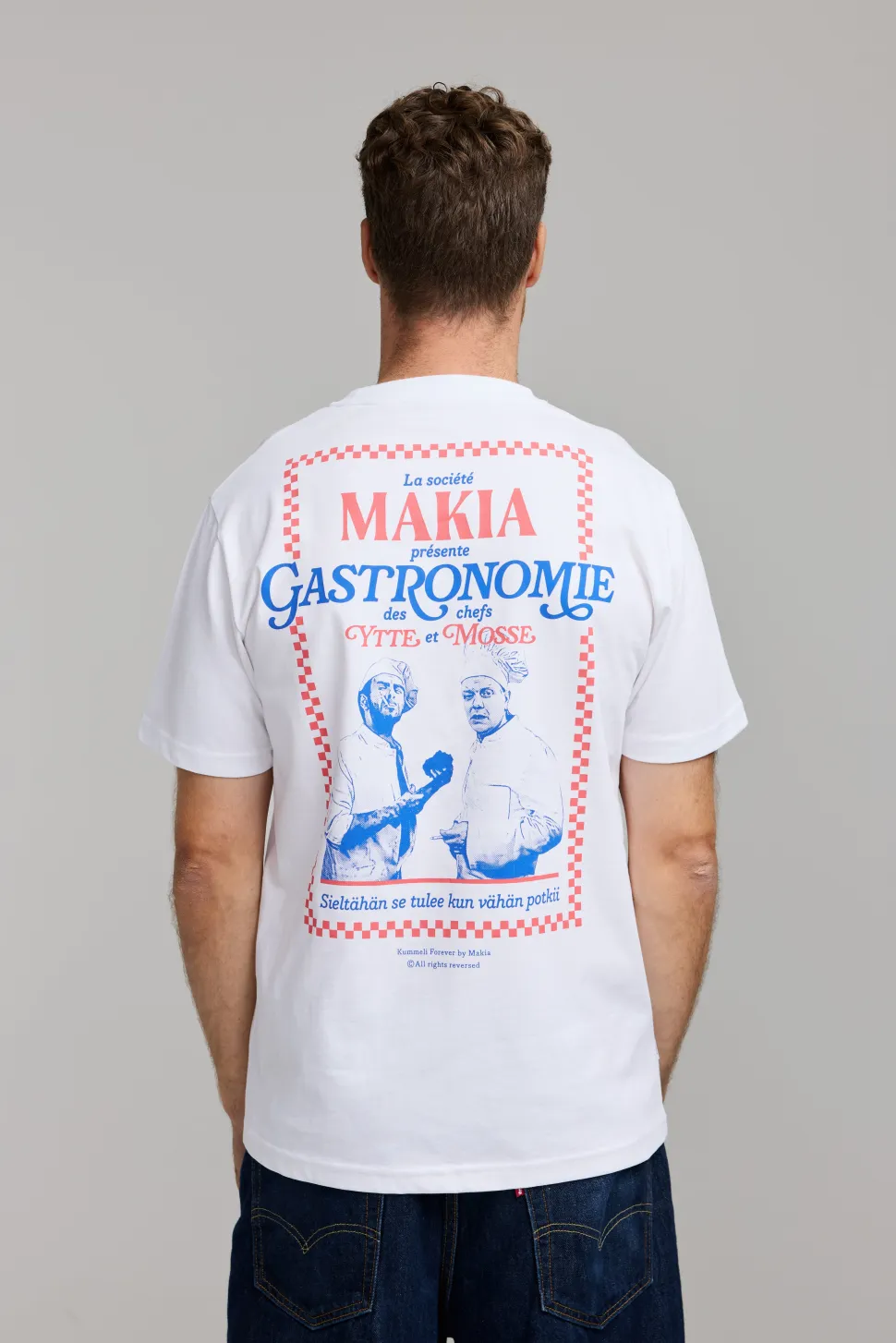 Kummeli Forever by Makia -malliston puuvillainen t-paita, jossa printti rinnassa edessä sekä näyttävä Gastronomie-printti selässä. Paidassa pyöreä pääntie ja lyhyet hihat.