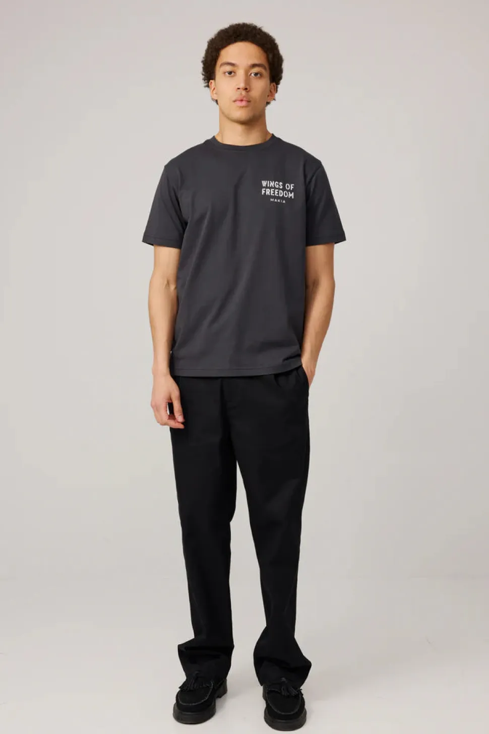Makia Wings T‑Shirt on ajaton ja laadukas musta miesten t‑paita, joka yhdistää minimalistisen skandinaavisen muotoilun ja arjen mukavuuden. Paidassa on klassinen pyöreä pääntie ja regular fit ‑leikkaus, joka istuu siististi mutta rennosti. Pehmeä ja hengittävä materiaali tuntuu miellyttävältä iholla ja tekee paidasta monikäyttöisen osan arjen pukeutumista – yhdistä farkkujen, chinojen tai shortsien kanssa tyylikkääksi kokonaisuudeksi. Rinnassa hillitty teksti-grafiikka ja selässä näyttävä printti, joka antaa paidalle persoonallisen ilmeen. Helppo valinta niin rentoihin arkihetkiin kuin vapaa‑ajan aktiviteetteihin.