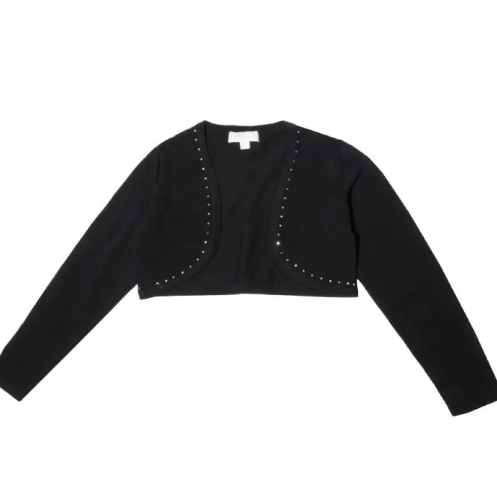Tyttöjen pitkähihaińen neulebolero. Reunassa strassikoristeet