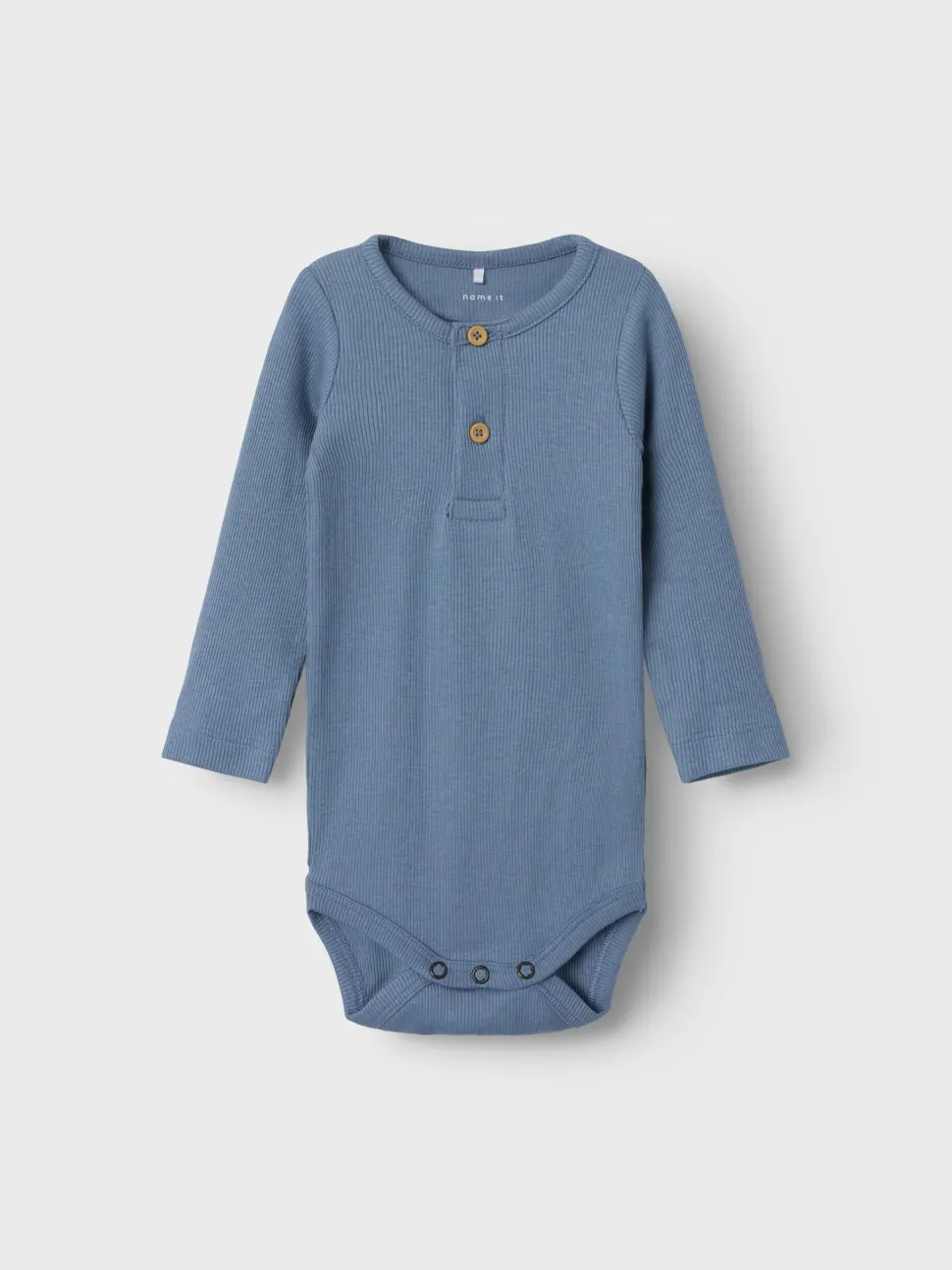 Lasten pitkähihainen body ribbineulosta. Kiinnitys neppareilla haarasta ja edessä pääntiellä nappihalkio.