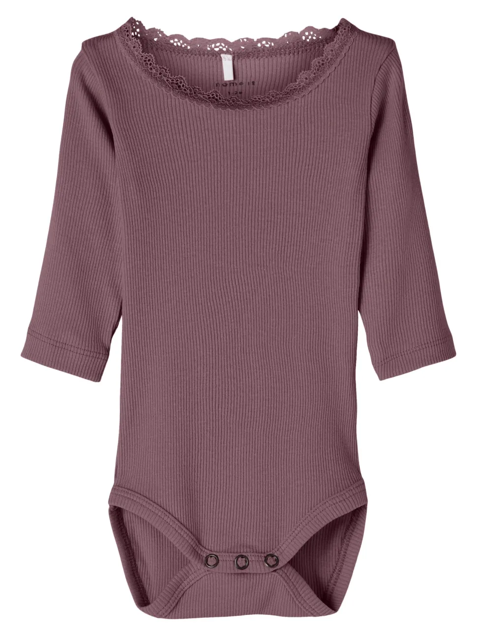 Name It lasten pitkähihaine ribbineulos body. Kiinnitys painonapeilla. Kauluksessa koristepitsiä. Tuotteen valmistuksessa on käytetty luomupuuvillaa.