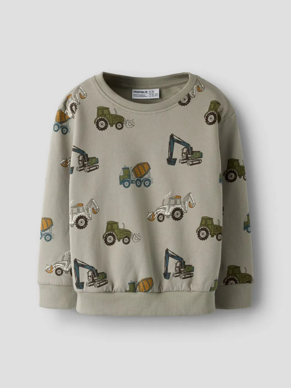 Name Itin lasten collegepaita on valmistettu mukavasta luomupuuvillakankaasta, jossa on ihanan pehmeäksi harjattu sisäpinta. Collegepaidassa on rento malli, pyöreä pääntie ja pitkät hihat. Hihansuissa, helmassa ja pääntiellä on joustavat resorit. Collegepaidan hauskassa kuosissa on erilaisia maatyökoneita – teema, joka on varmasti monelle lapselle mieleen.