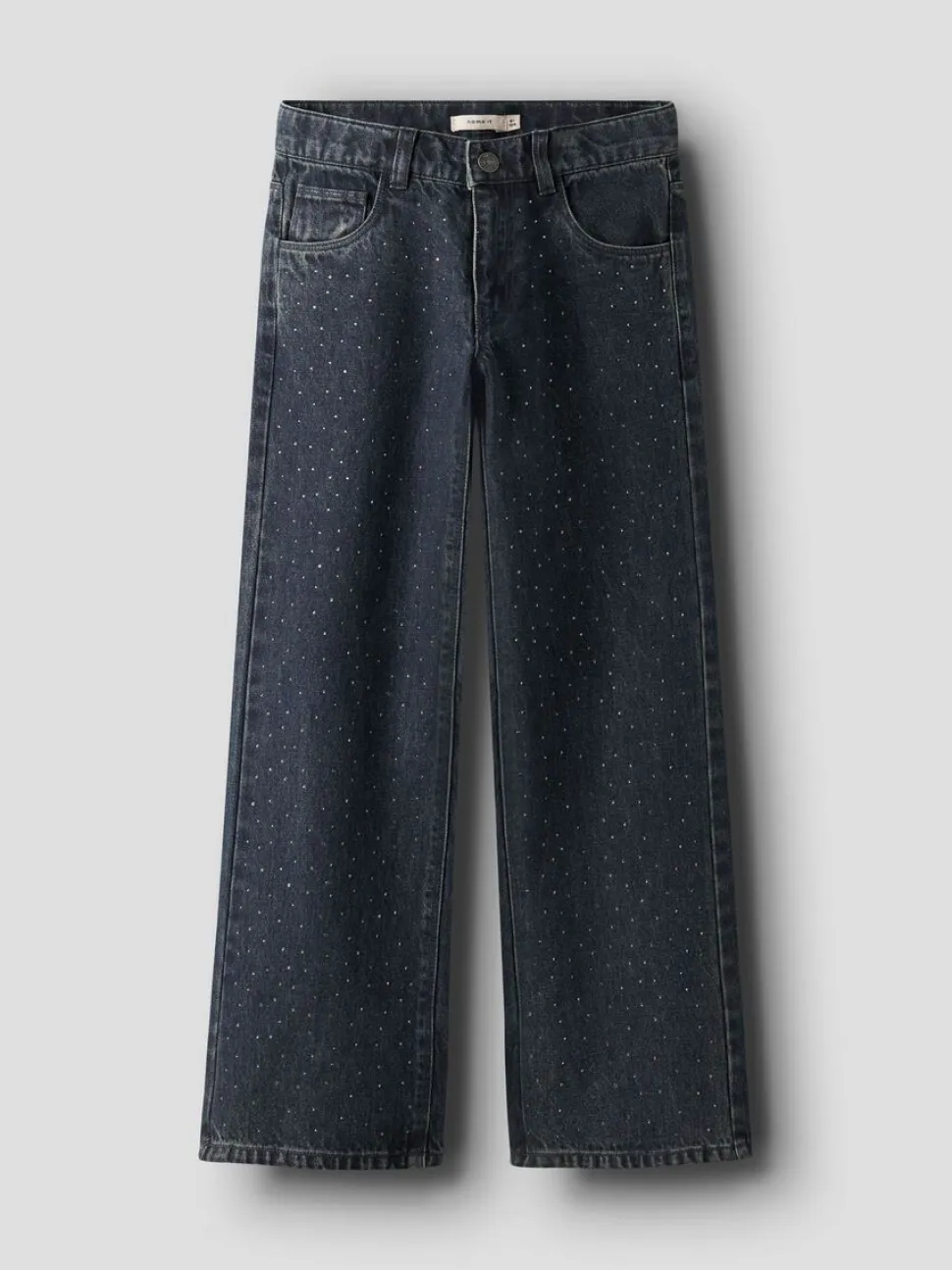Name it Rhinestone Wide Leg Jeans Dark Midnight Denim -farkut tarjoavat näyttävän yhdistelmän trendikästä muotoilua ja arjen käytännöllisyyttä. Leveälahkeinen malli tarjoaa rentoutta ja liikkumavaraa, ja etutaskut, takataskut sekä kolikkotasku yhdistyvät metallisiin strassikoristeisiin, jotka tuovat ripauksen säihkettä tummansiniseen “Dark Midnight Denim” -denimiin. Vyötäröllä on nappi- ja vetoketjukiinnitys, mikä viimeistelee huolitellun ilmeen. Materiaali koostuu 80 % puuvillasta ja 20 % kierrätetystä puuvillasta, mikä yhdistää mukavuuden ja vastuullisuuden.
