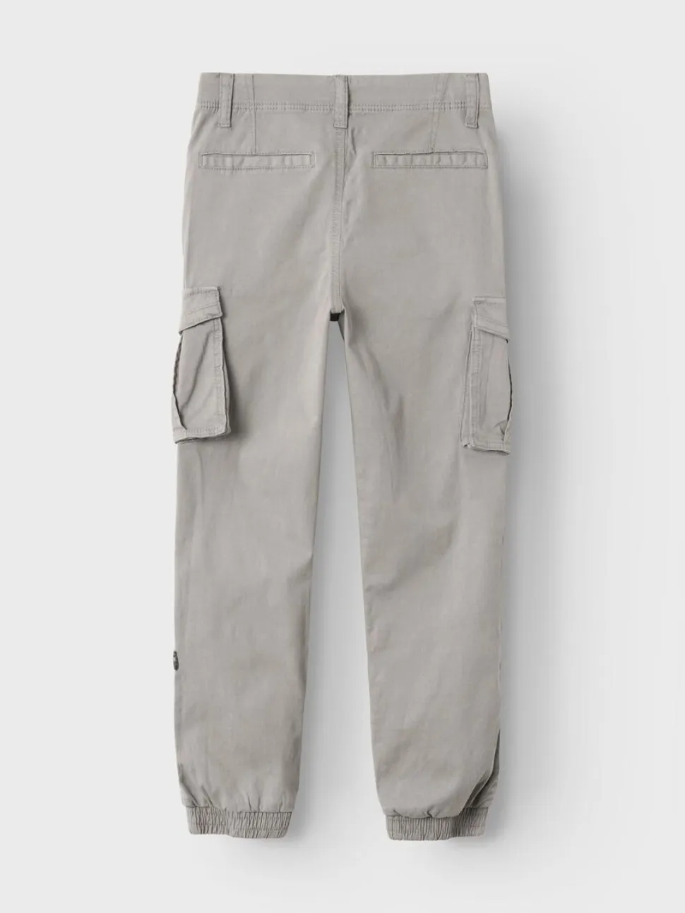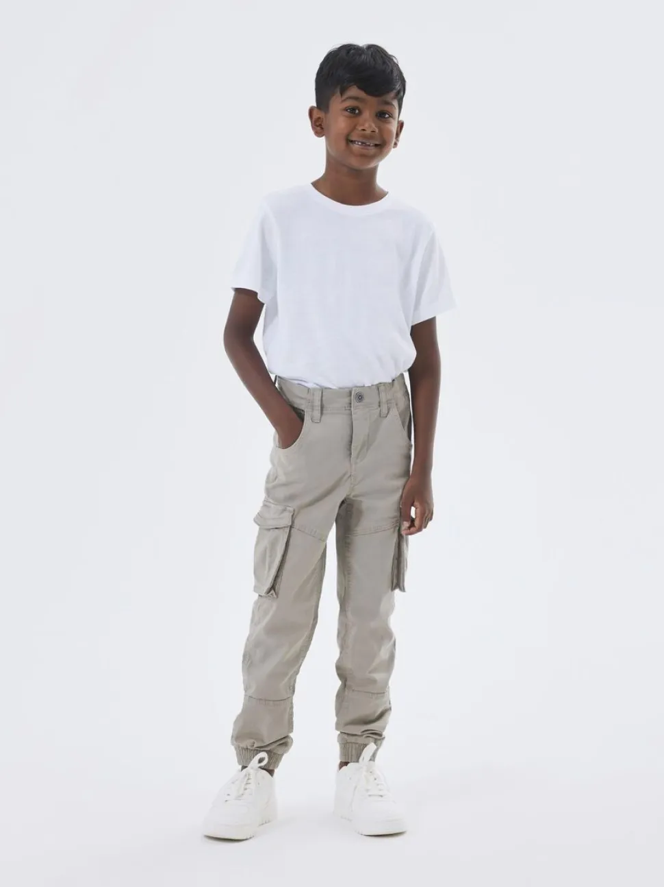 Name it rennot twillhousut. Reisitaskuissa neppariläpät ja lahkeissa kuminauhat. Takana koristetaskut.