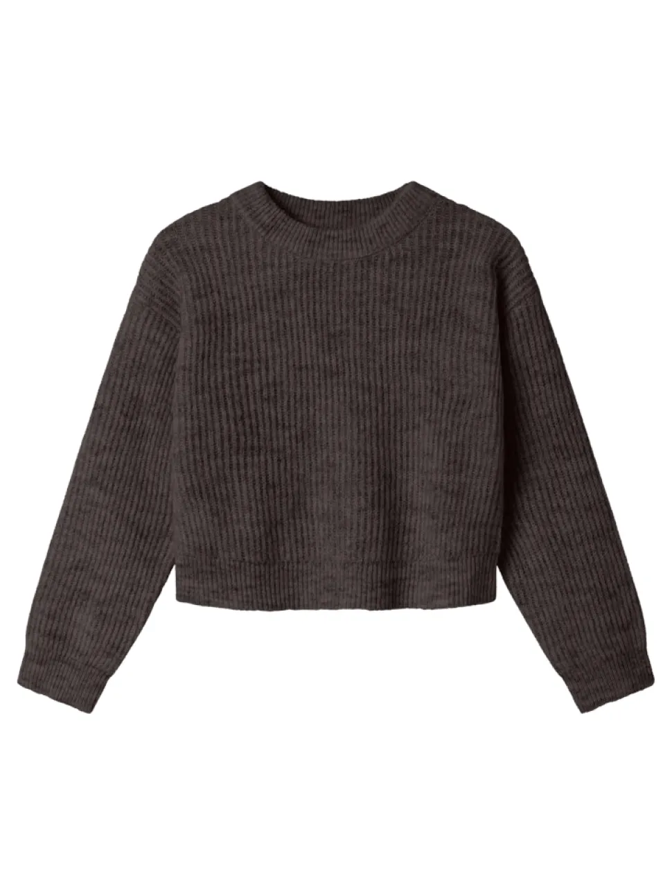 Neuleessa on pyöreä pääntie, pitkät hihat, pudotetut olkapäät ja resorilliset hihansuut.