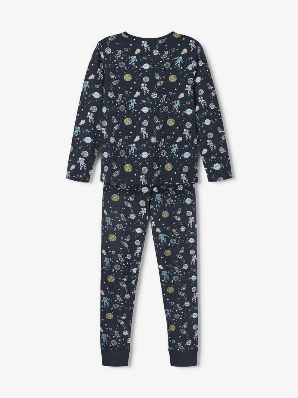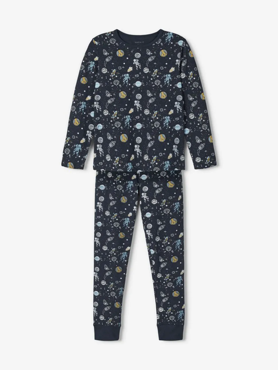 Name It lasten kuviollinen pyjama, joka on valmistettu luomupuuvillasekoitteesta. Pehmeä ja joustava materiaali, joka tuntuu päällä mukavalta. Setissä on pitkähihainen t-paita ja pitkät housut.