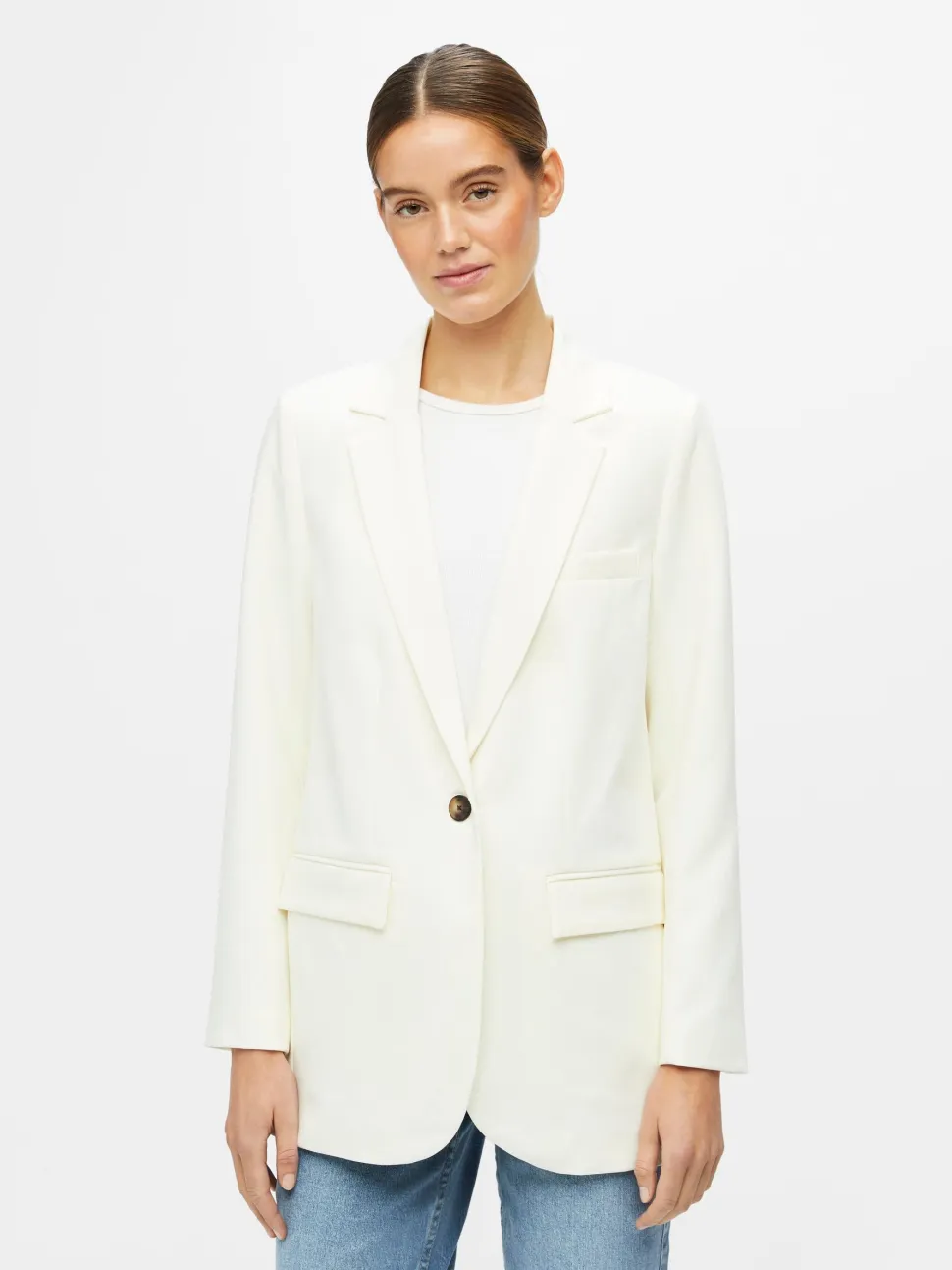 Klassikko bleiseri kääntökauluksella ja kaksi läpällistä taskua. Regular fit.
